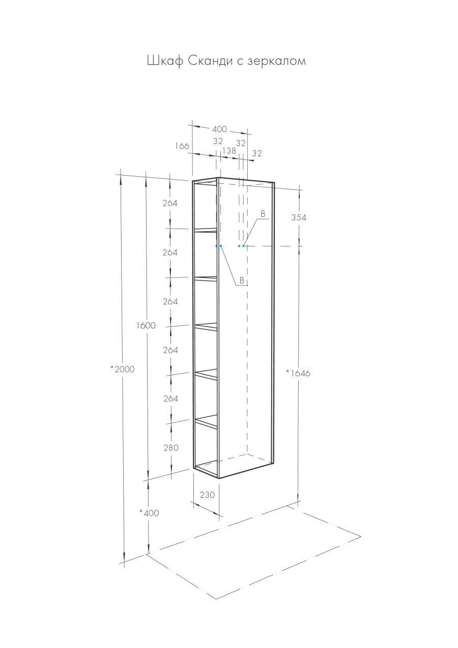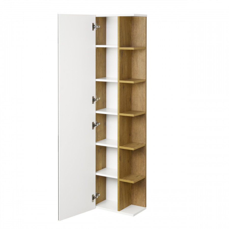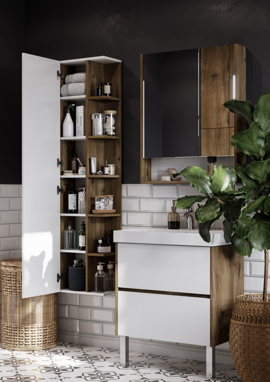 В состав коллекции входит необычная шкаф-колонна, за зеркальными створками расположены нерегулируемые (верхние и нижние) и 3 регулируемые полочки (по центру), и разделенные перегородкой открытые полочки, таким образом, обеспечивая легкий доступ к открытым полкам без необходимости открывания фасада.