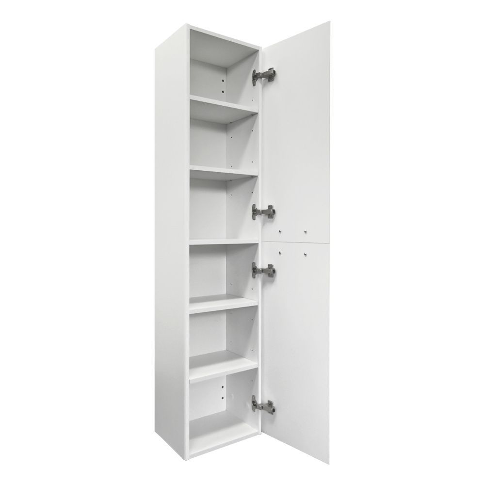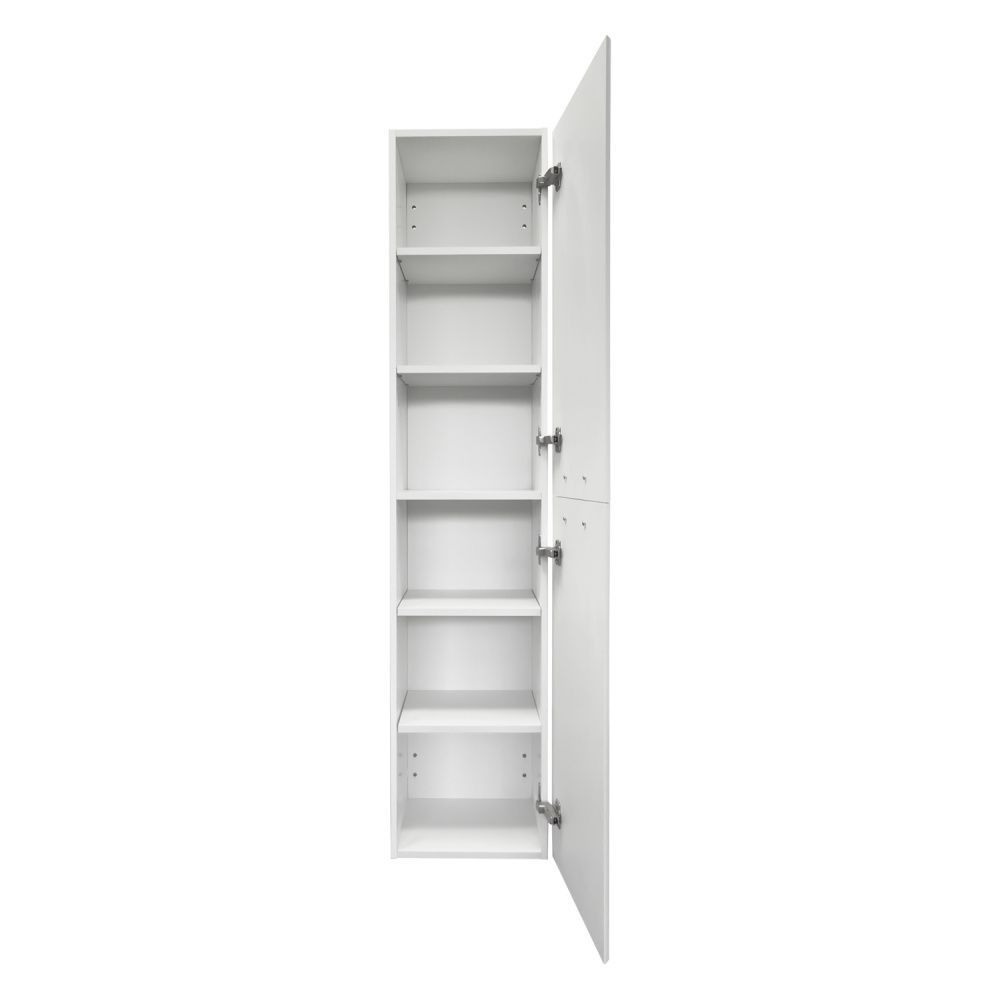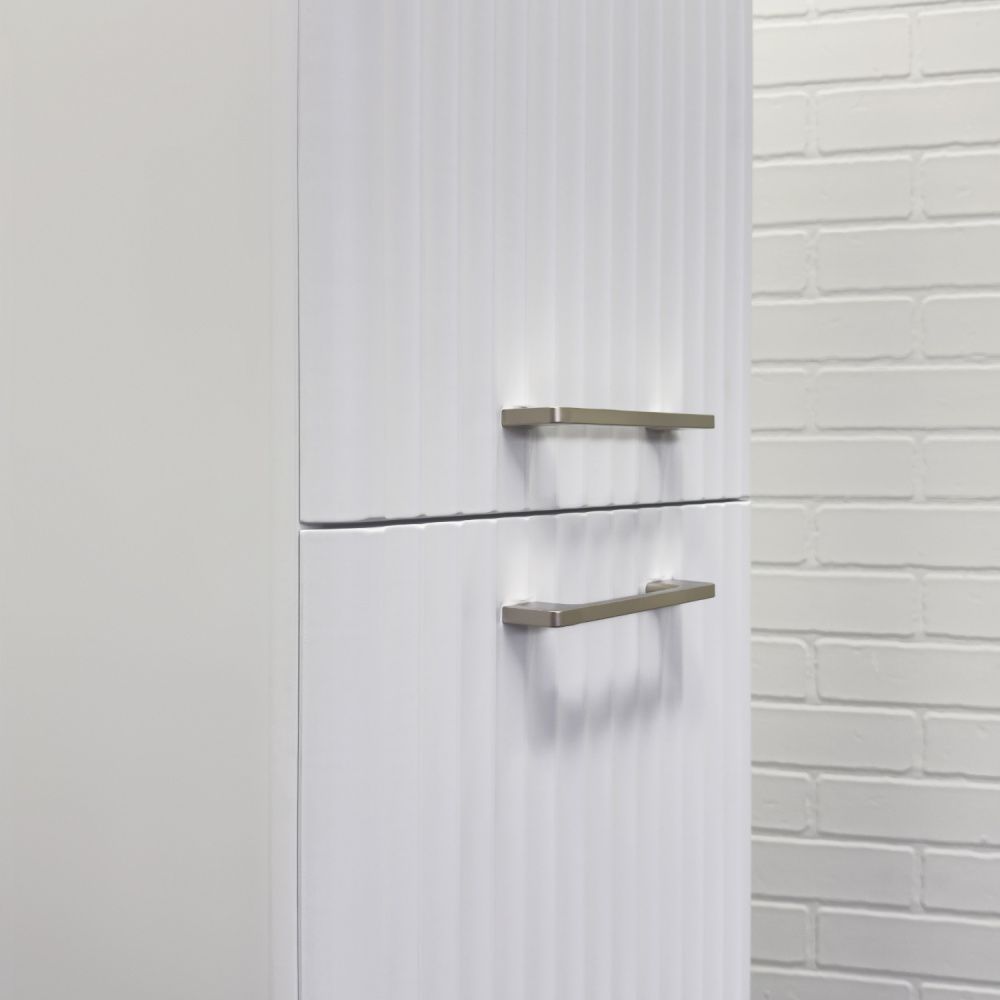 Подвесная шкаф-колонна отличное решение для хранения разных предметов необходимых в ванной комнате. За верхней дверцей и нижней створками по две полки. Петли оборудованы механизмами плавного закрывания.