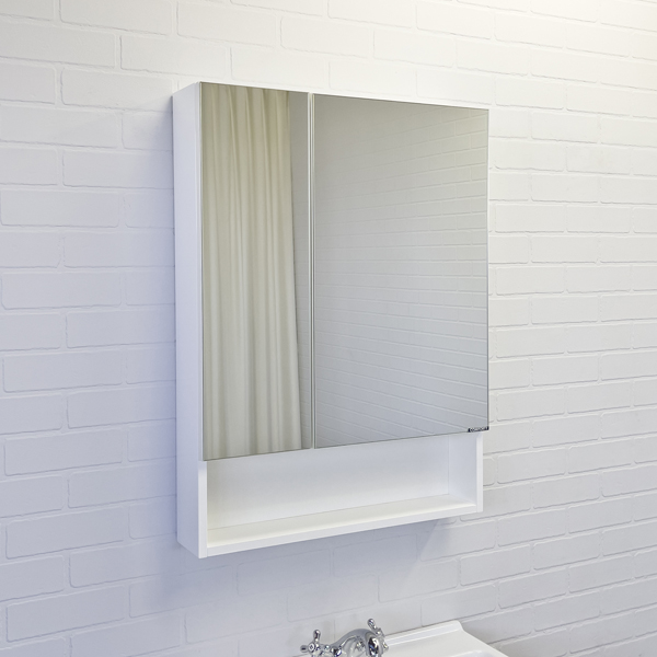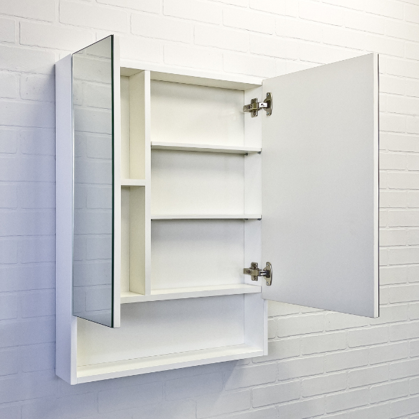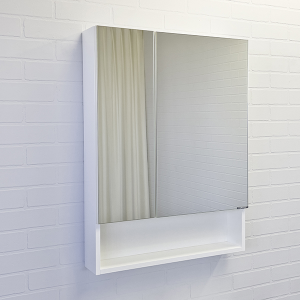 Створки оснащены петлями с плавным закрыванием. Высококачественное зеркальное полотно с амальгамой на основе серебра. Обе боковые створки зеркала открываются наружу. За широкой створкой две горизонтальные полки, за узкой одна. На нижней внешней полке можно расположить невысокие принадлежности для умывания.