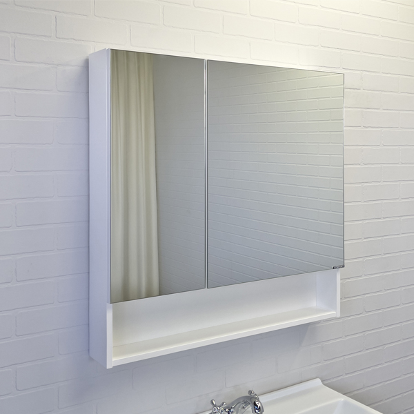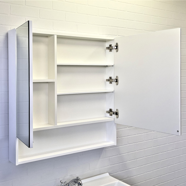 Створки оснащены петлями с плавным закрыванием. Высококачественное зеркальное полотно с амальгамой на основе серебра. Обе боковые створки зеркала открываются наружу. За широкой створкой две горизонтальные полки, за узкой одна. На нижней внешней полке можно расположить невысокие принадлежности для умывания.