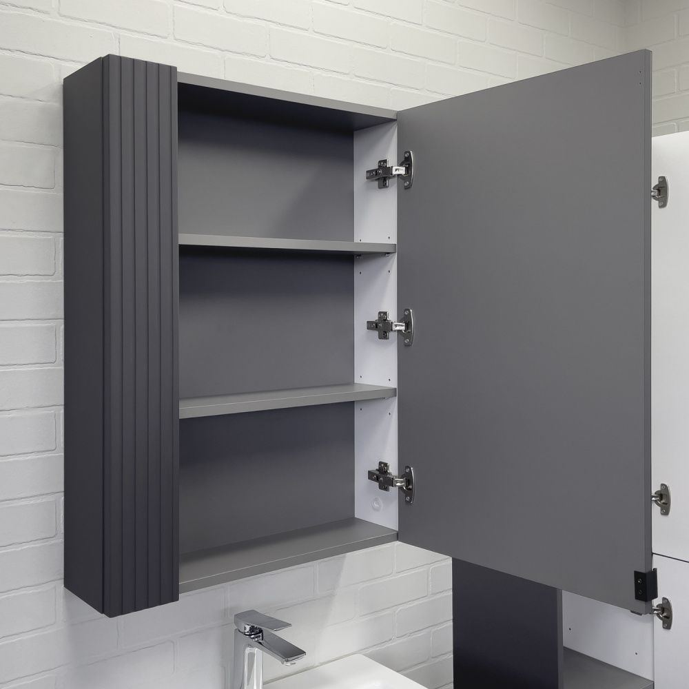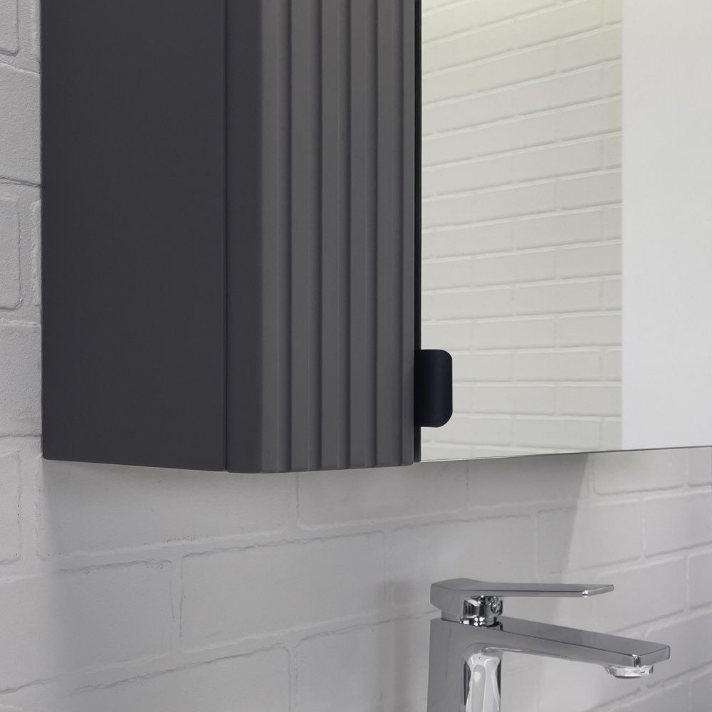 Зеркальное высококачественное полотно с амальгамой на основе серебра. Створка декорирована вертикальной фрезеровкой и оснащена петлями плавного закрывания. За створкой две полки. В модели применяется плёнка с эффектом Soft-Touch.