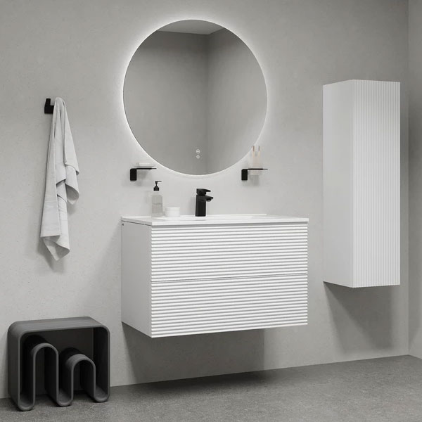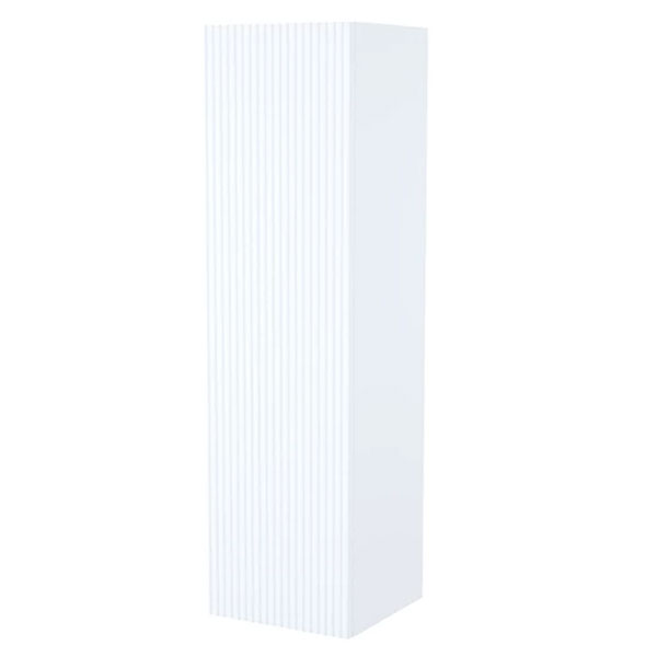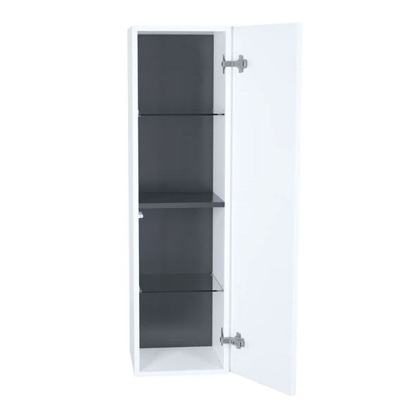 Пенал подвесной, Bild. Размеры: 320*300*1090 (Д*Ш*В). Система установки: навесная. Материал фасада: МДФ 19 мм. Материал боковин: МДФ 16 мм. Направление фрезеровки фасада: вертикальное. Покрытие фасада и боковин: пленка ПВХ. Цвет: белый матовый. Материал полок: стекло. Фурнитура: Iddis, Boyard. Система открывания: Push-to-Open. Одна дверь пенала без деления. Открывание фасадов универсальное (правое и левое в зависимости от навешивания).