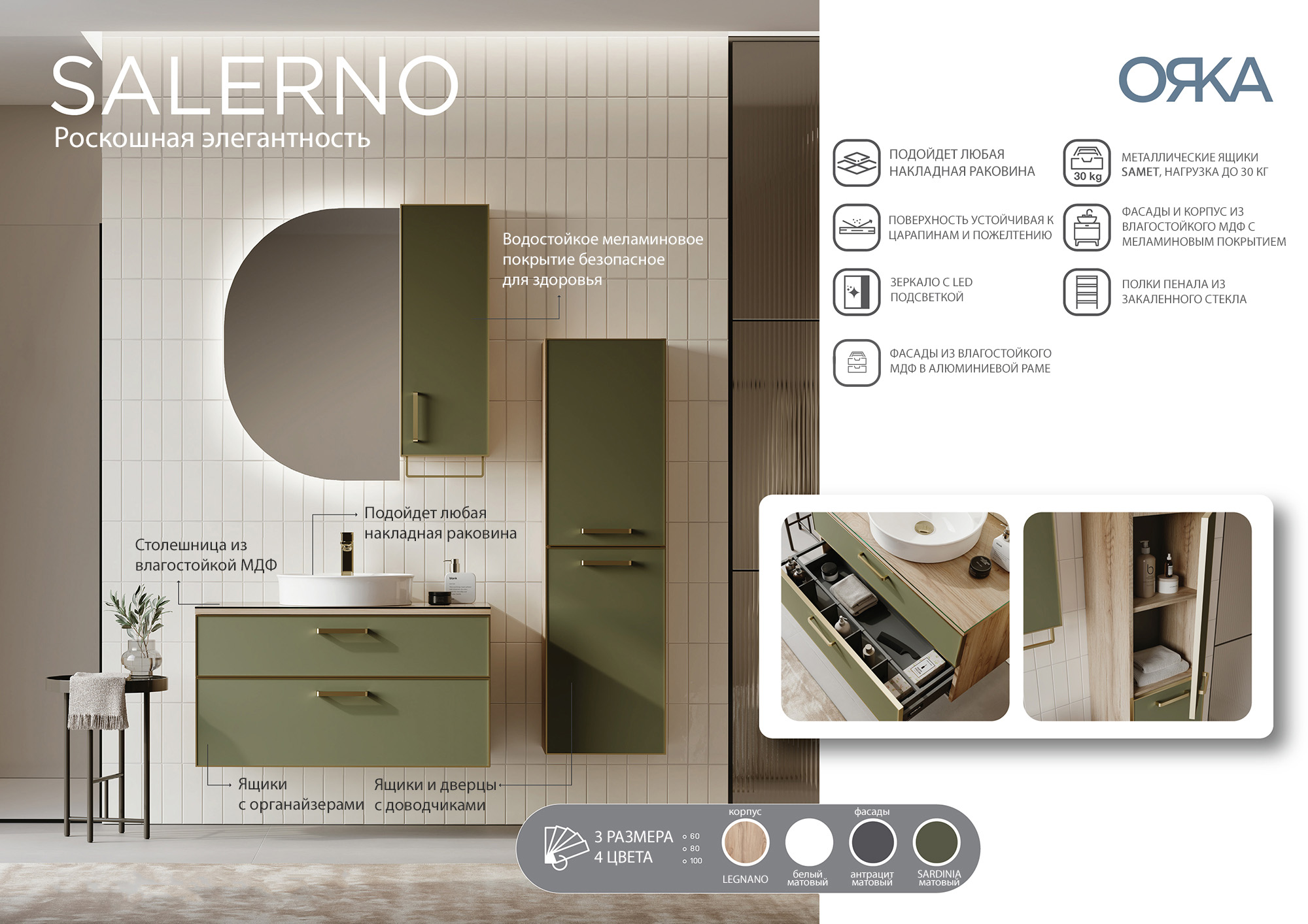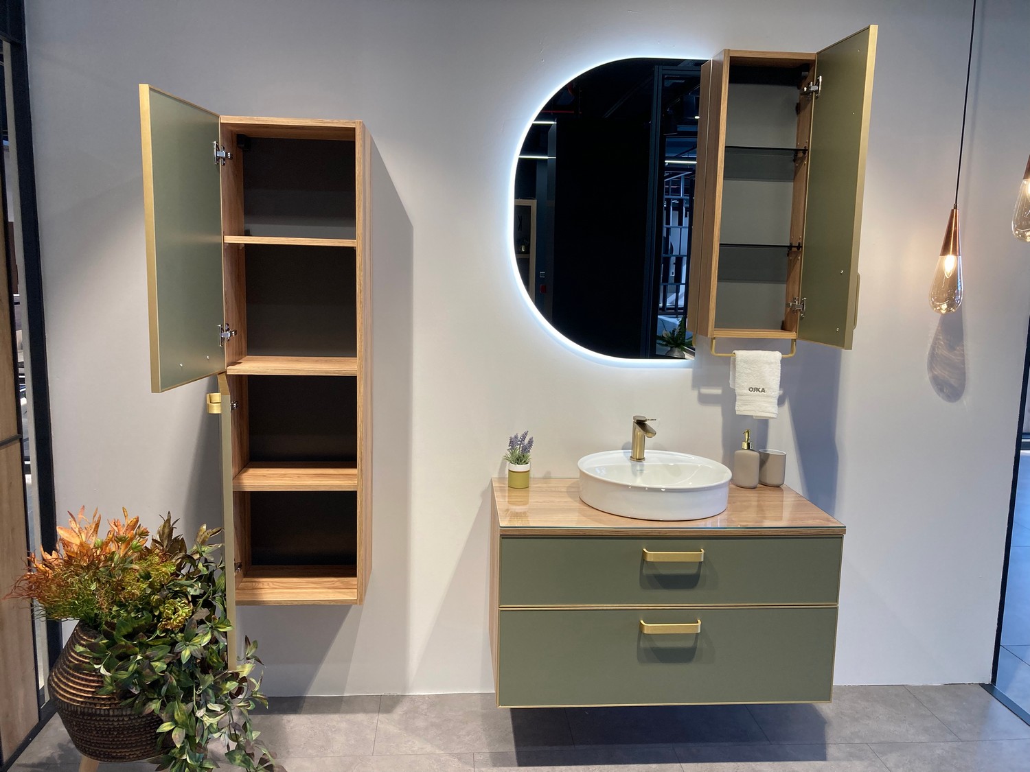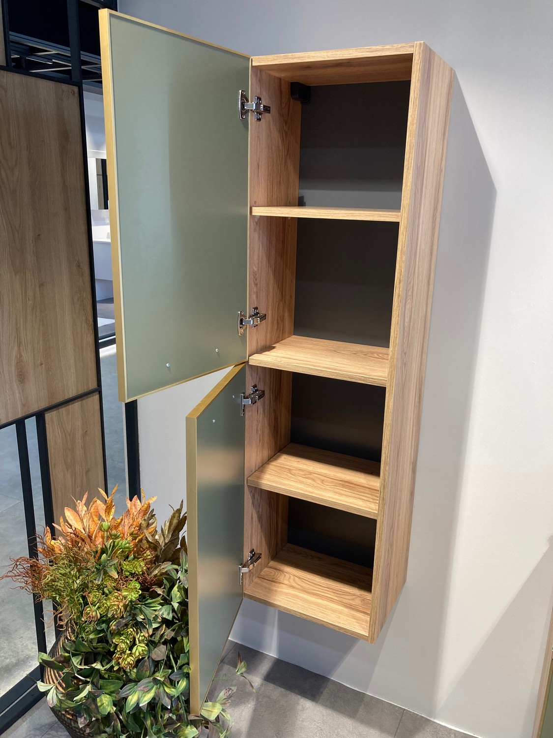 Пенал подвесной Orka Salerno 400x320x1380 зеленый матовый, светлое дерево (3005748)