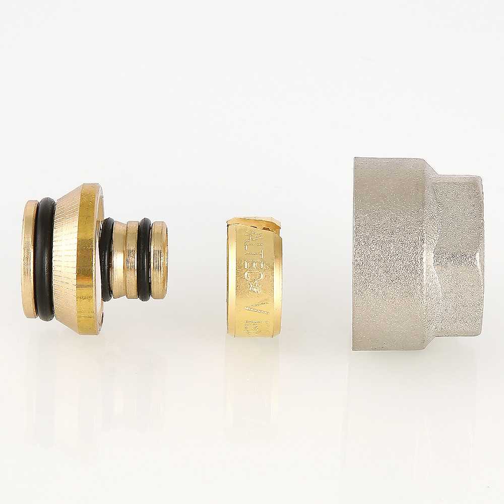 Латунный фитинг с накидной гайкой и обжимным кольцом для подключения металлополимерной трубы к коллектору VALTEC с выходами диаметром 3/4", стандарт соединения – «евроконус».