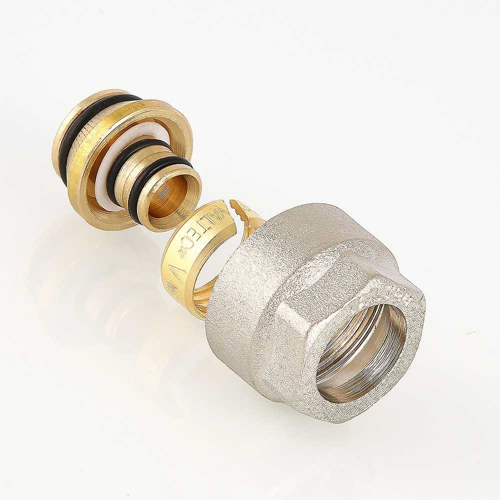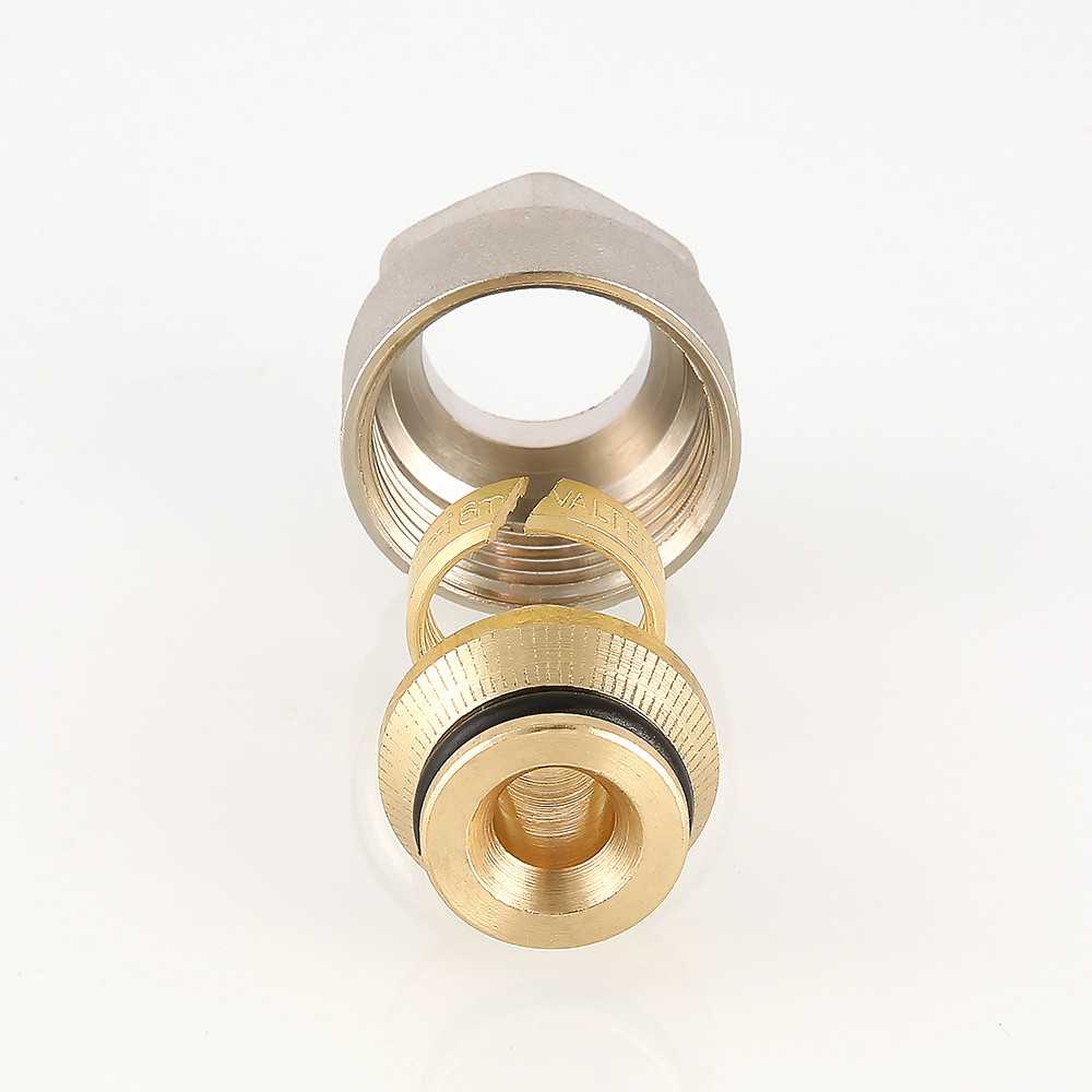 Латунный фитинг с накидной гайкой и обжимным кольцом для подключения металлополимерной трубы к коллектору VALTEC с выходами диаметром 3/4", стандарт соединения – «евроконус».