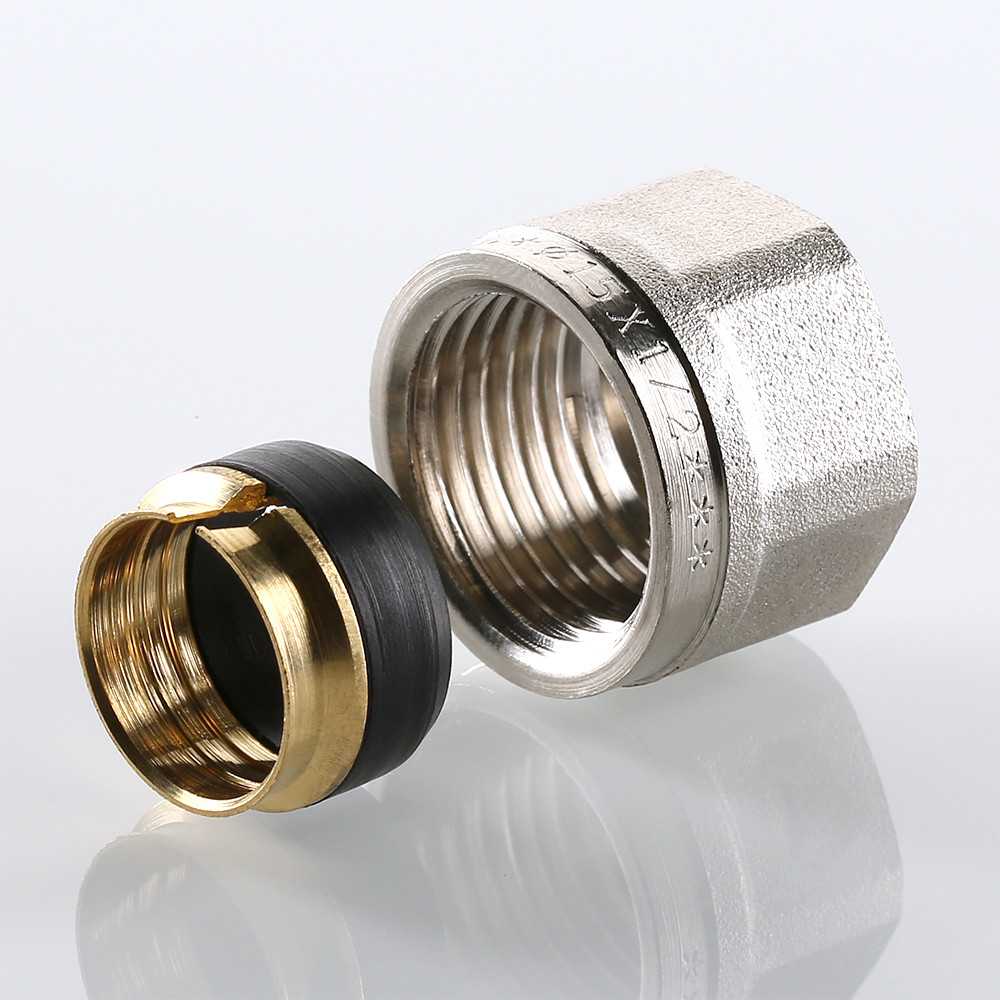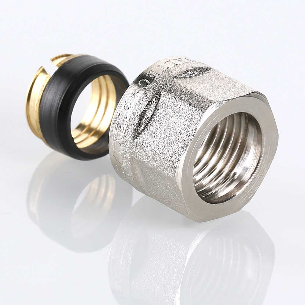 Латунный обжимной фитинг с накидной гайкой, обжимным кольцом и резиновым уплотнением для подключения медной трубы диаметром 15 мм к коллектору VALTEC.