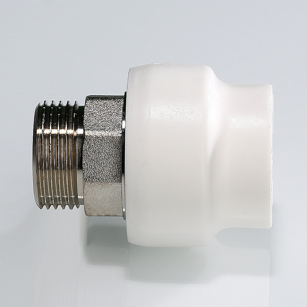 Прямой полипропиленовый фитинг для соединения полипропиленовой трубы и компонента инженерной системы с резьбовым подключением. Резьба фитинга – наружная трубная по ГОСТу 6357. Предусмотрен участок закладной детали под гаечный ключ.