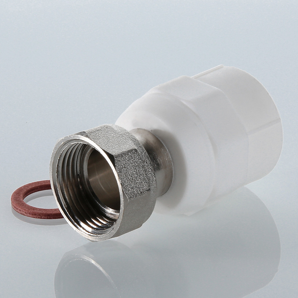 Прямой комбинированный фитинг (фитинг полипропиленовый) для соединения полипропиленовой трубы и компонента инженерной системы с резьбовым подключением. Монтаж осуществляется с помощью накидной гайки. Резьба – внутренняя трубная по ГОСТу 6357. Предусмотрен участок корпуса под гаечный или трубный рычажный ключ.