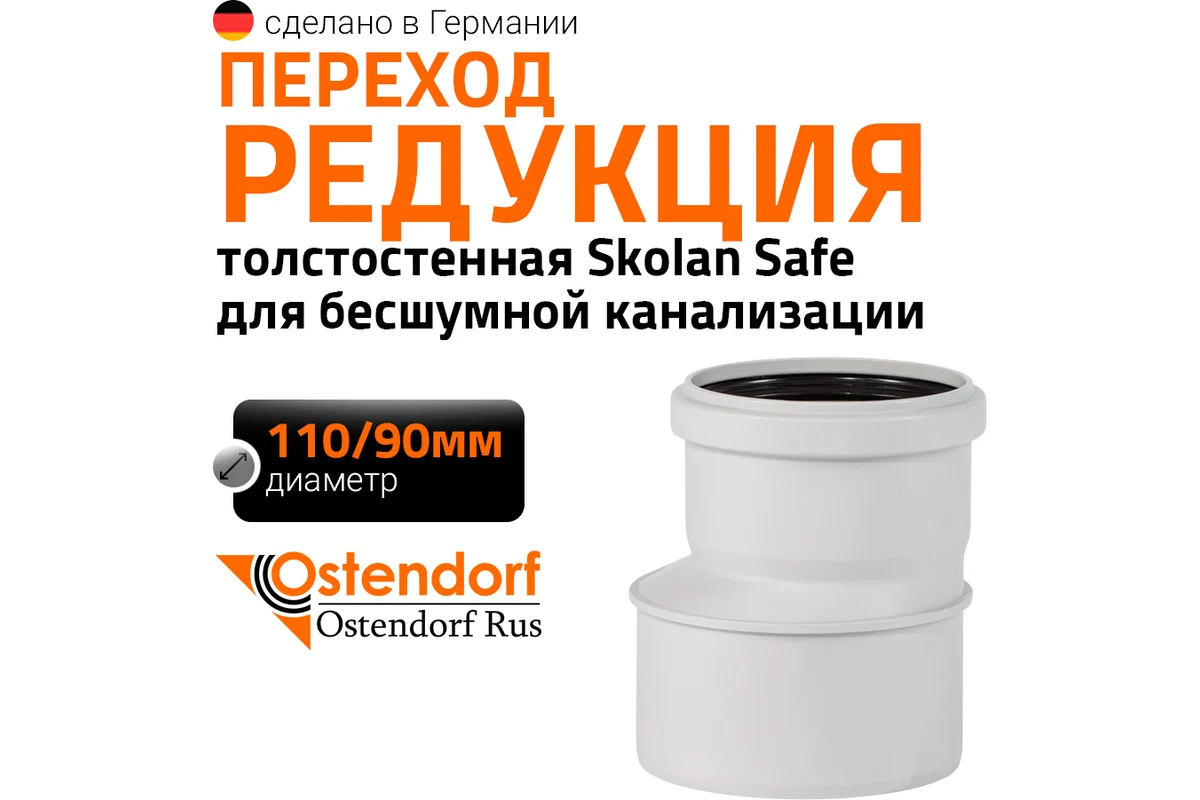 Переход бесшумной канализации Ostendorf Skolan Safe предназначена для перехода с большего на меньший диаметр, устанавливается в раструб большего диаметра.