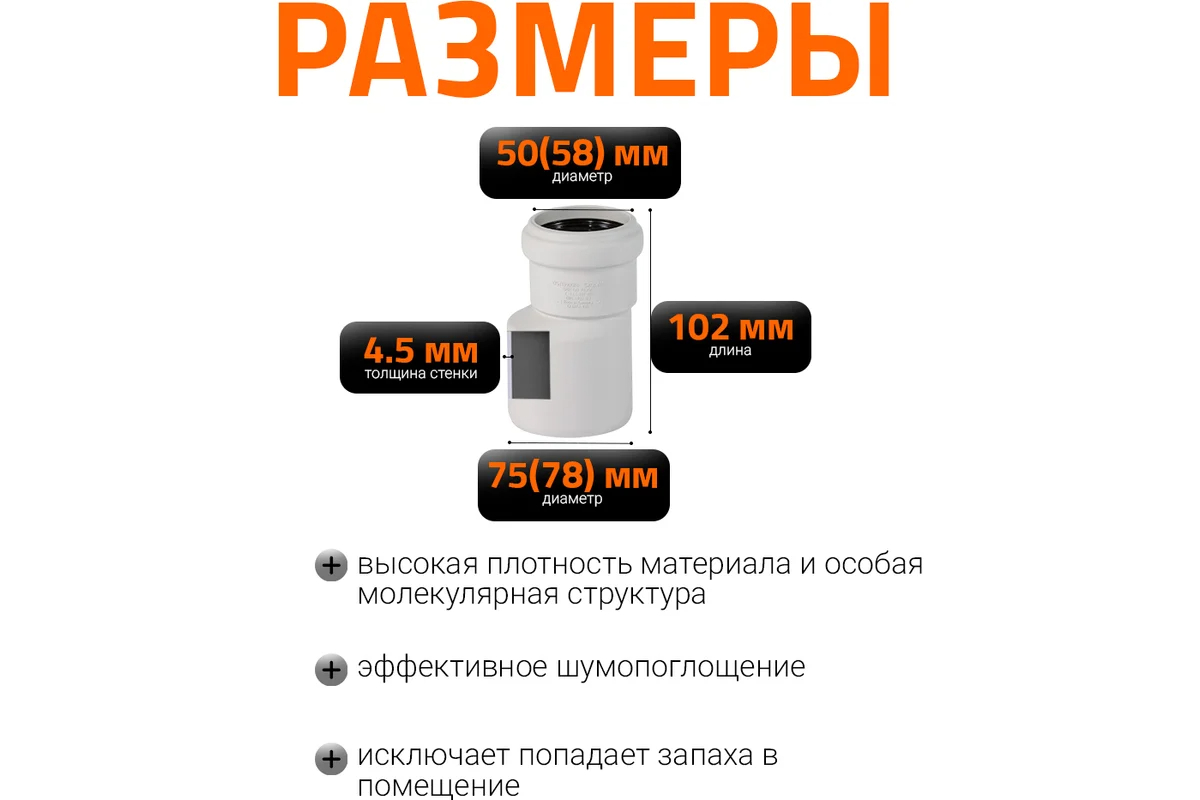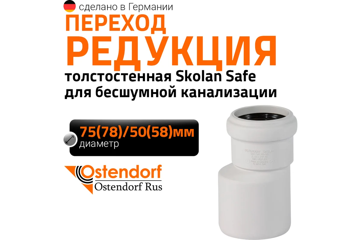 Редукция бесшумной канализации Ostendorf Skolan Safe предназначена для перехода с большего на меньший диаметр, устанавливается в раструб большего диаметра.