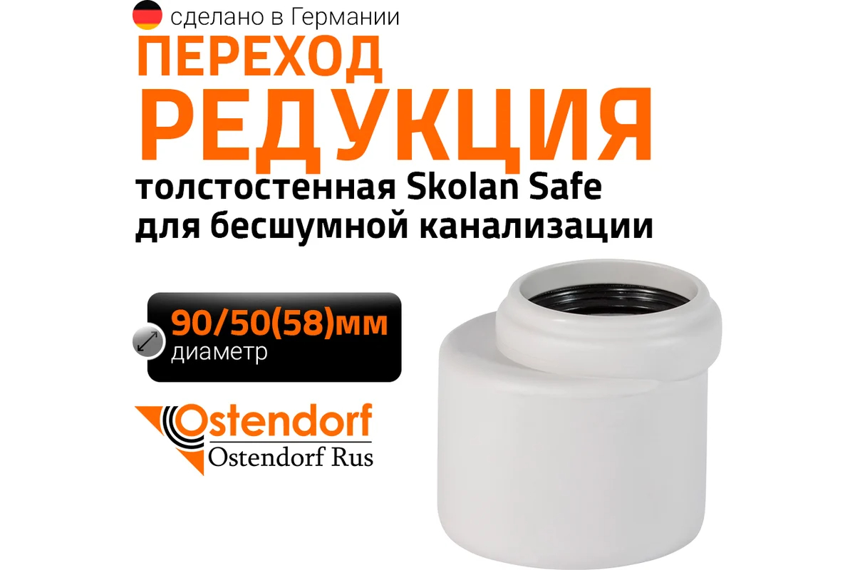 Редукция бесшумной канализации Ostendorf Skolan Safe предназначена для перехода с большего на меньший диаметр, устанавливается в раструб большего диаметра.