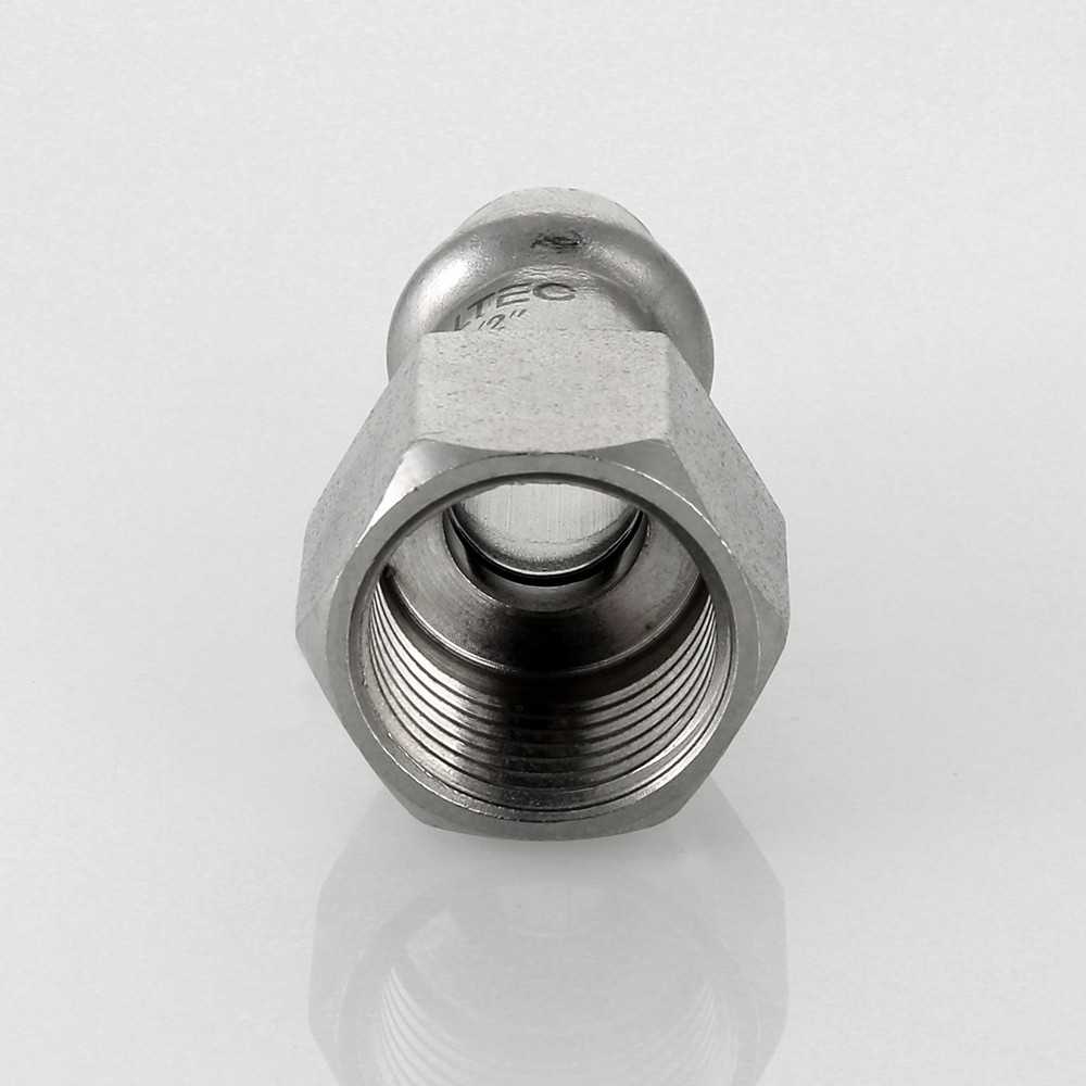 Пресс-фитинг из нержавеющей стали с внутренней резьбой обеспечивает соединение тонкостенной стальной трубы с резьбовым элементом монтируемой системы. Область применения – трубопроводы водоснабжения, отопления, иные инженерные и технологические установки с рабочей температурой до 120 °С и давлением до 16 бар.