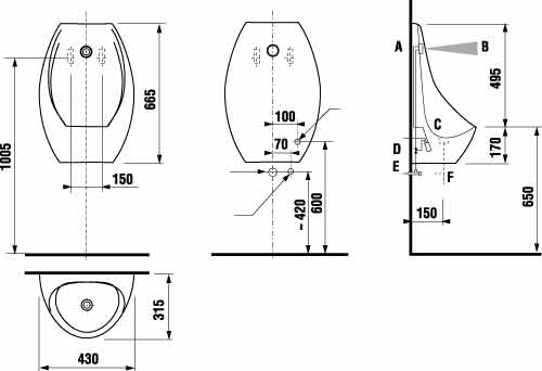 Писсуар с ИК-датчиком, питание 24 В, внутреннее подключение воды, подключение канализации: горизонтальное, в стену.