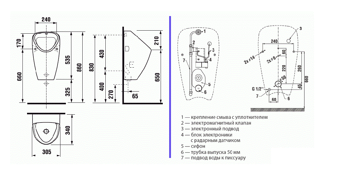 Антивандальный настенный писсуар с радарным датчиком автоматического смывания, внутреннее подключение воды, подключение канализации: горизонтальное в стену, питание от сети 220 B (через блок питания).