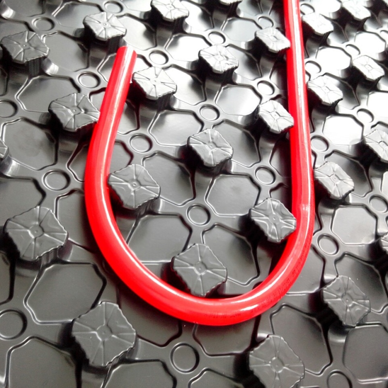 Плита предназначена для укладки водяного отопления в полу, крайний ряд бобышек на плите имеет уменьшенный размер и измененную форму, что позволяет фиксировать бобышки одна в другую (внахлёст) для создания единого полотна