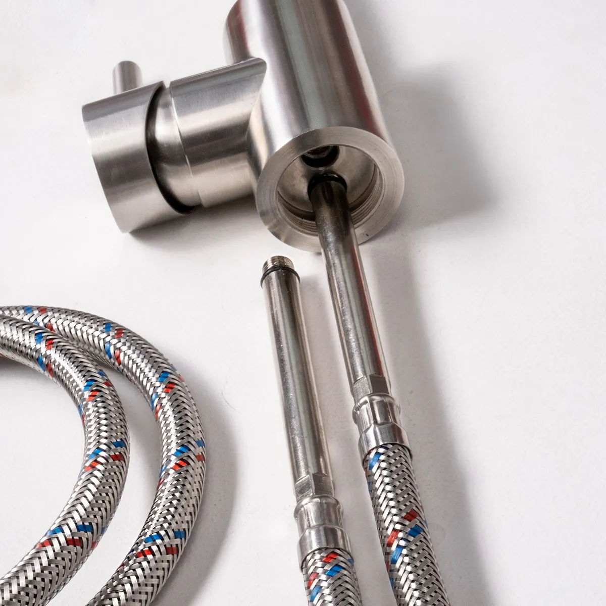 Гибкая подводка для смесителя с удлинённым штуцером М-10 MONOFLEX Longer напрямую от производителя в оплетке из нержавеющей стали 301 с вкраплениями красных и синих нейлоновых нитей, характеризующих горячее и холодное водоснабжение, а также латунными фитингами, удлинённым штуцером и внутренним шлангом EPDM.
