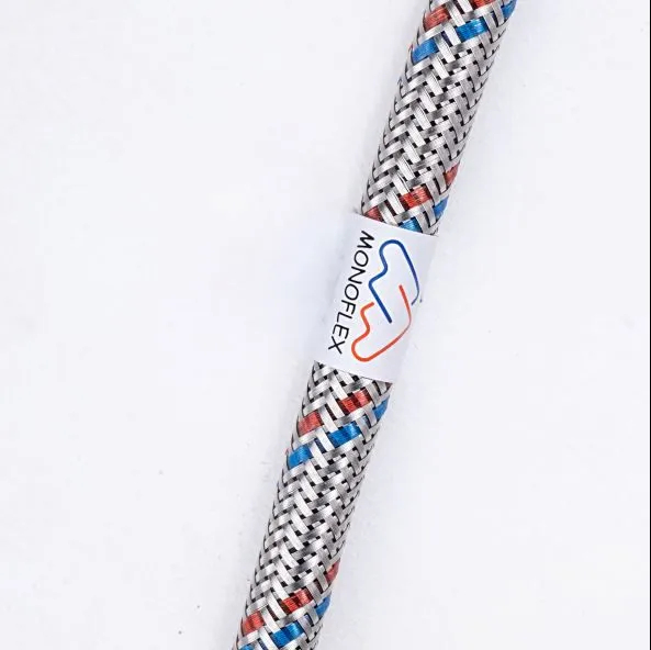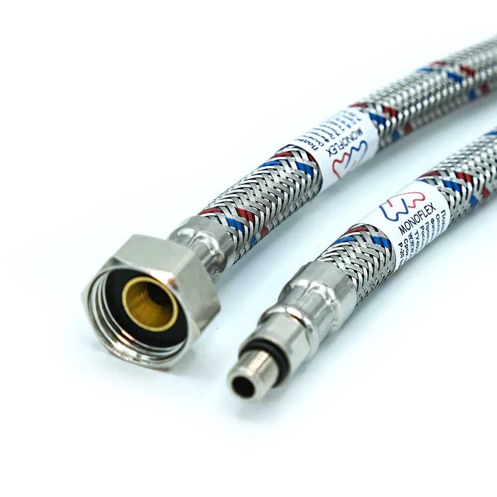 Стандарт (гайка 1/2" штуцер М8) в оплетке из нержавеющей стали с вкраплениями красных и синих нейлоновых нитей, характеризующих горячее и холодное водоснабжение, латунными фитингами и внутренним шлангом EPDM. Применяется при монтаже смесителей.