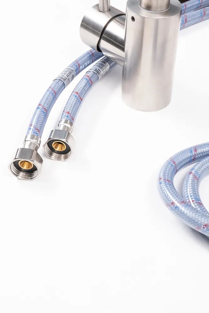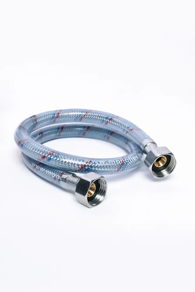 в оплетке с двойным ультра прочным полимерным покрытием, латунными фитингами и внутренним шлангом EPDM. Применяется при монтаже смесителей, сливных бачков унитазов, биде, душевых кабин, счетчиков воды и фильтров.