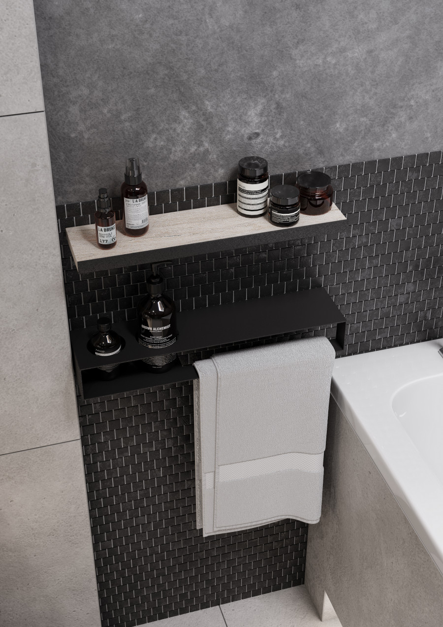 Металлическая полка выполненная в дизайне коллекции Лофт Урбан для создания единого интерьера ванной комнаты, позволит разместить декоративные или косметические средства. Отверстия можно использовать для стаканчиков для зубных щеток или бутылочек с уходовыми средствами. На рейлинге можно разместить полотенце. Подставка выполнена из металлического профиля, окрашенного с помощью порошковой окраски, предотвращающей коррозию.
