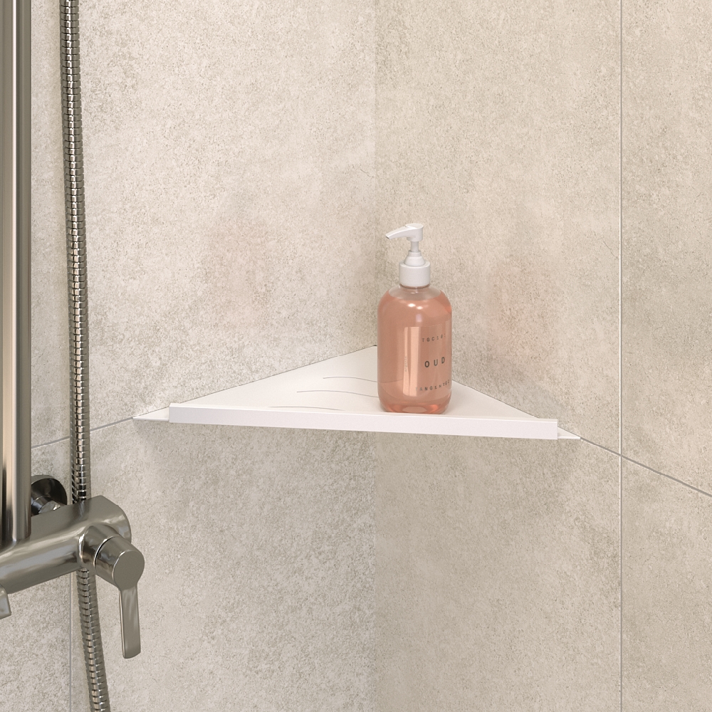 Полки для душевой зоны, разработанные специально для монтажа после завершения ремонта, т. е. укладки плитки. Легко устанавливаются в любые угловые зоны в помещении, для этого прорезается шов между плитками, далее полочка вклеивается между плиткой на любой бытовой герметик.