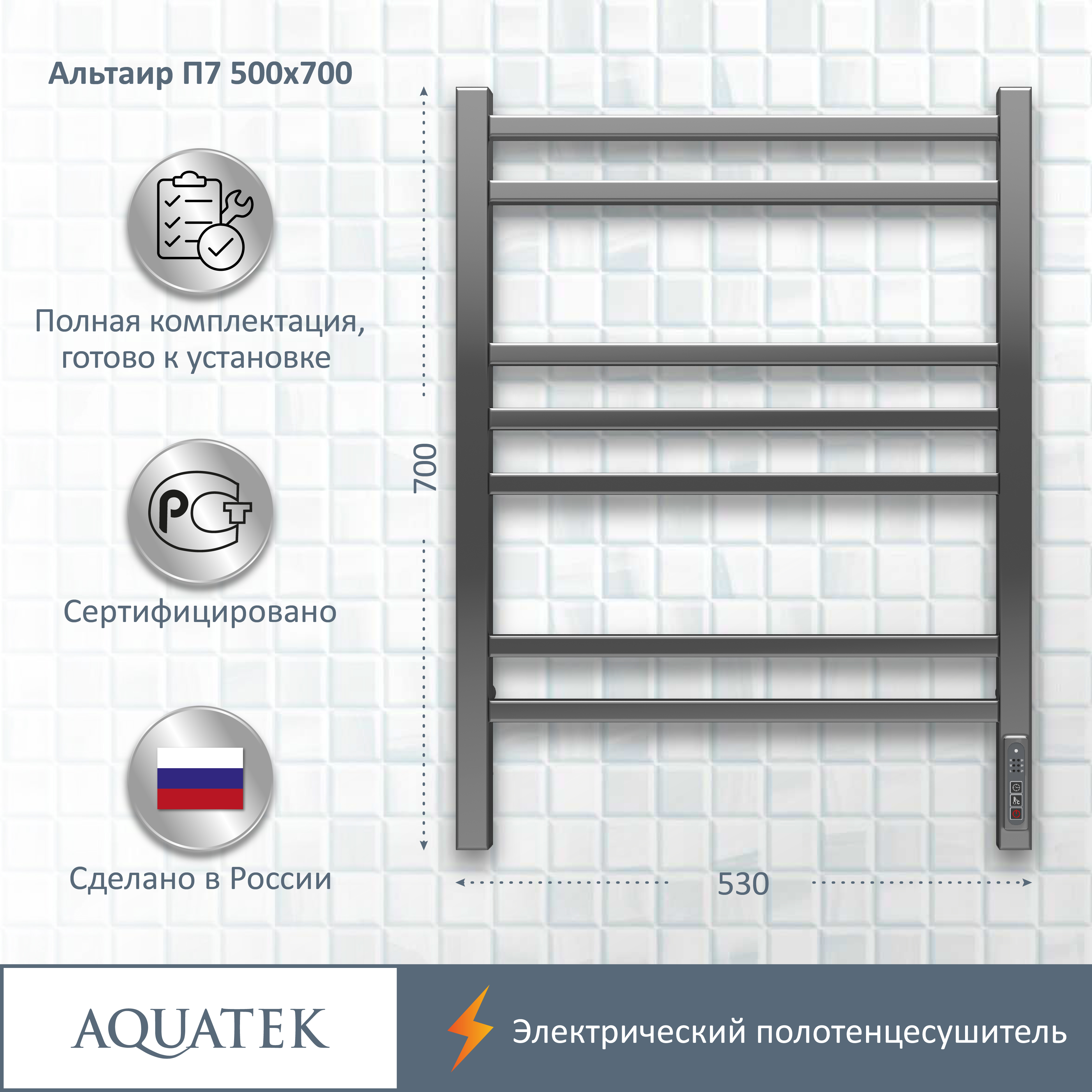 Полотенцесушитель электрический Aquatek (Акватек) Альтаир П7 500х700 мм, подключение скрытое к сети электропитания / электропровод с вилкой, с терморегулятором и таймером quick touch, нержавеющая сталь AISI 201, гарантия 5 лет
