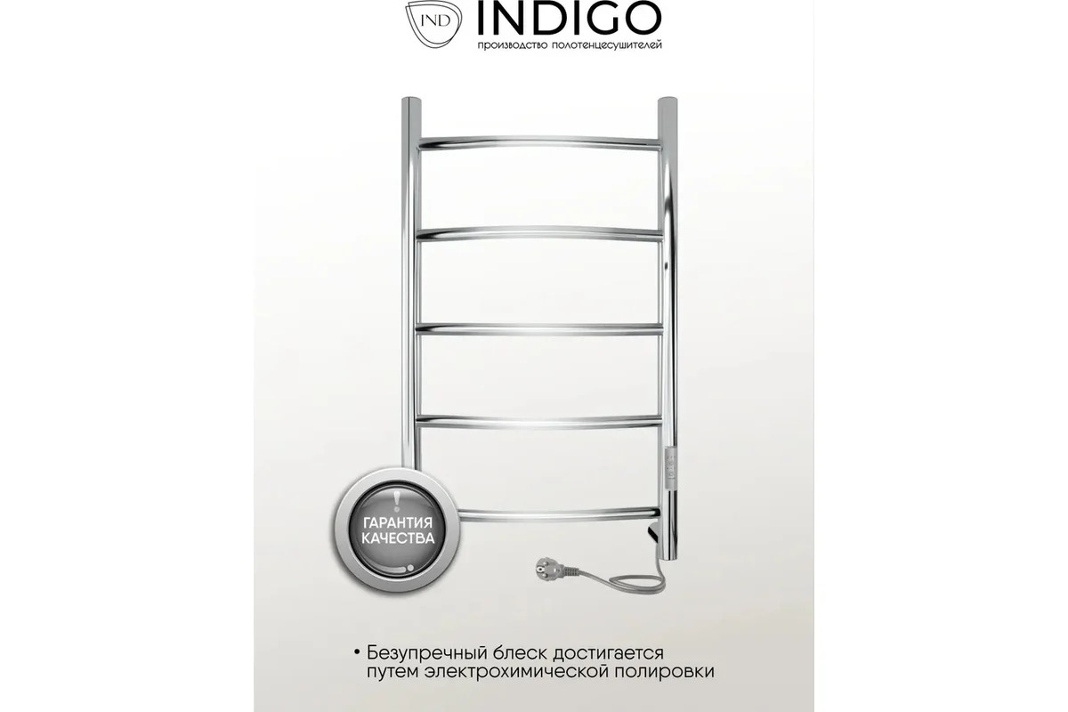 Полотенцесушитель электрический INDIGO Arc Lux выполнен из нержавеющей стали. Изделие в форме «лесенка» с дугообразными перекладинами выполнен в цвете «хром». Качественная металлообработка в местах соединений обеспечивает плотное прилегание прокладки.
