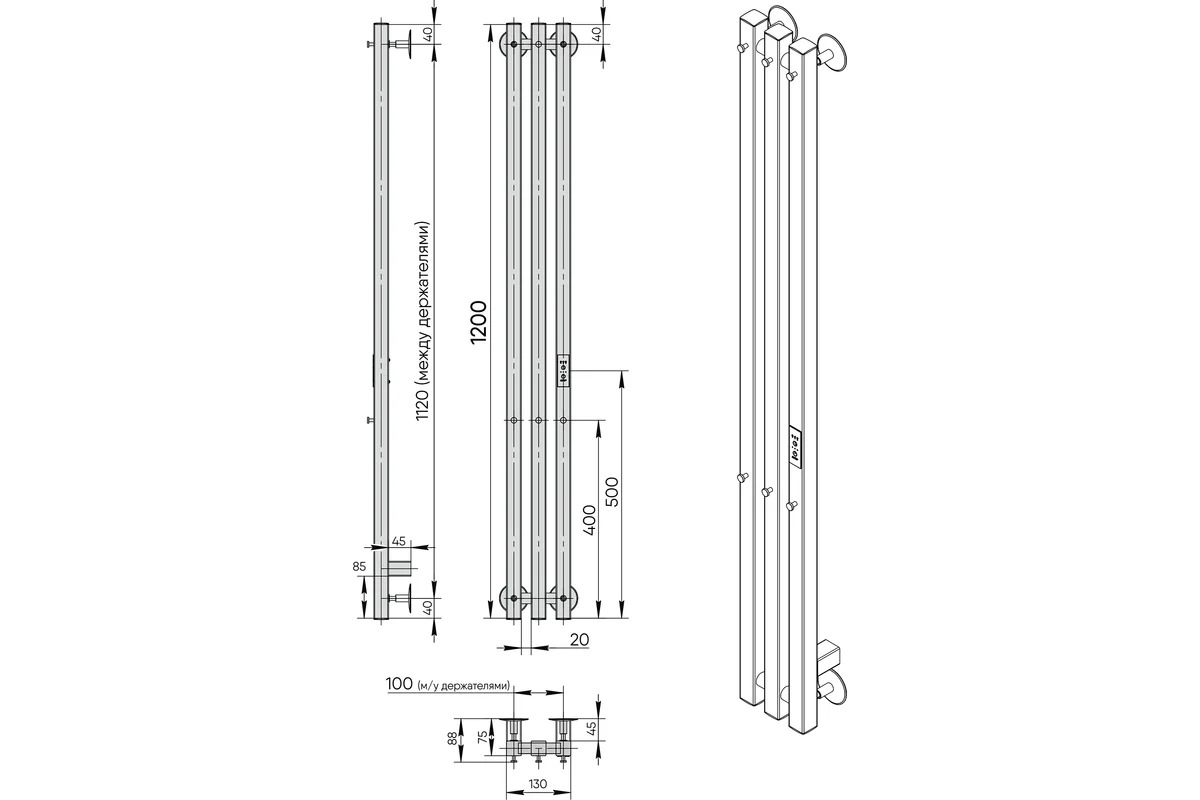 Комплектация: Полотенцесушитель электрический - 1 шт, паспорт изделия - 1 шт, комплект для монтажа - 1 шт, держатель телескопический - 4 шт. (квадрат)