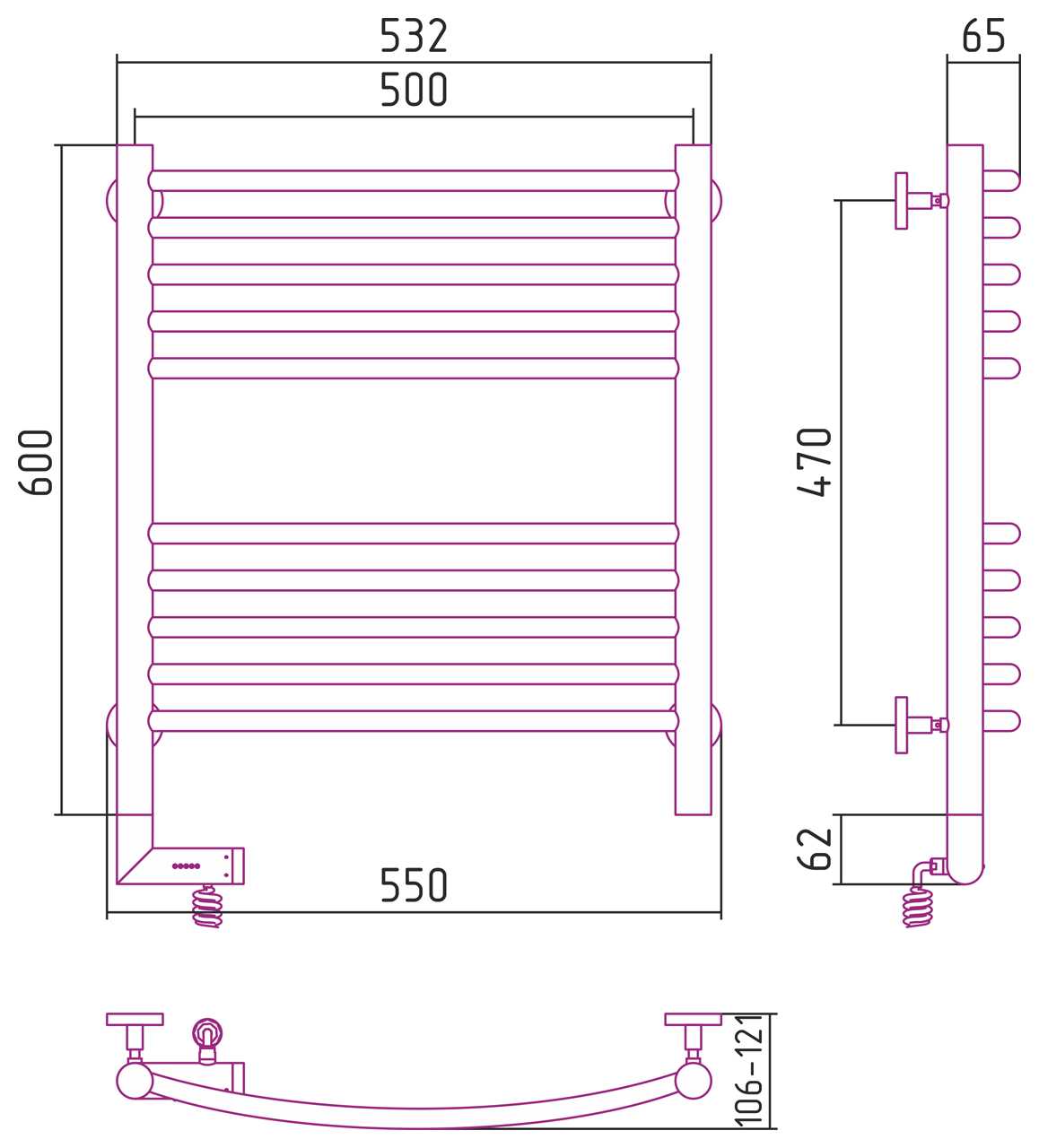 Полотенцесушитель электрический Сунержа Богема 2.0 выгнутая 600x500 МЭМ левый, хром (00-5202-6050)