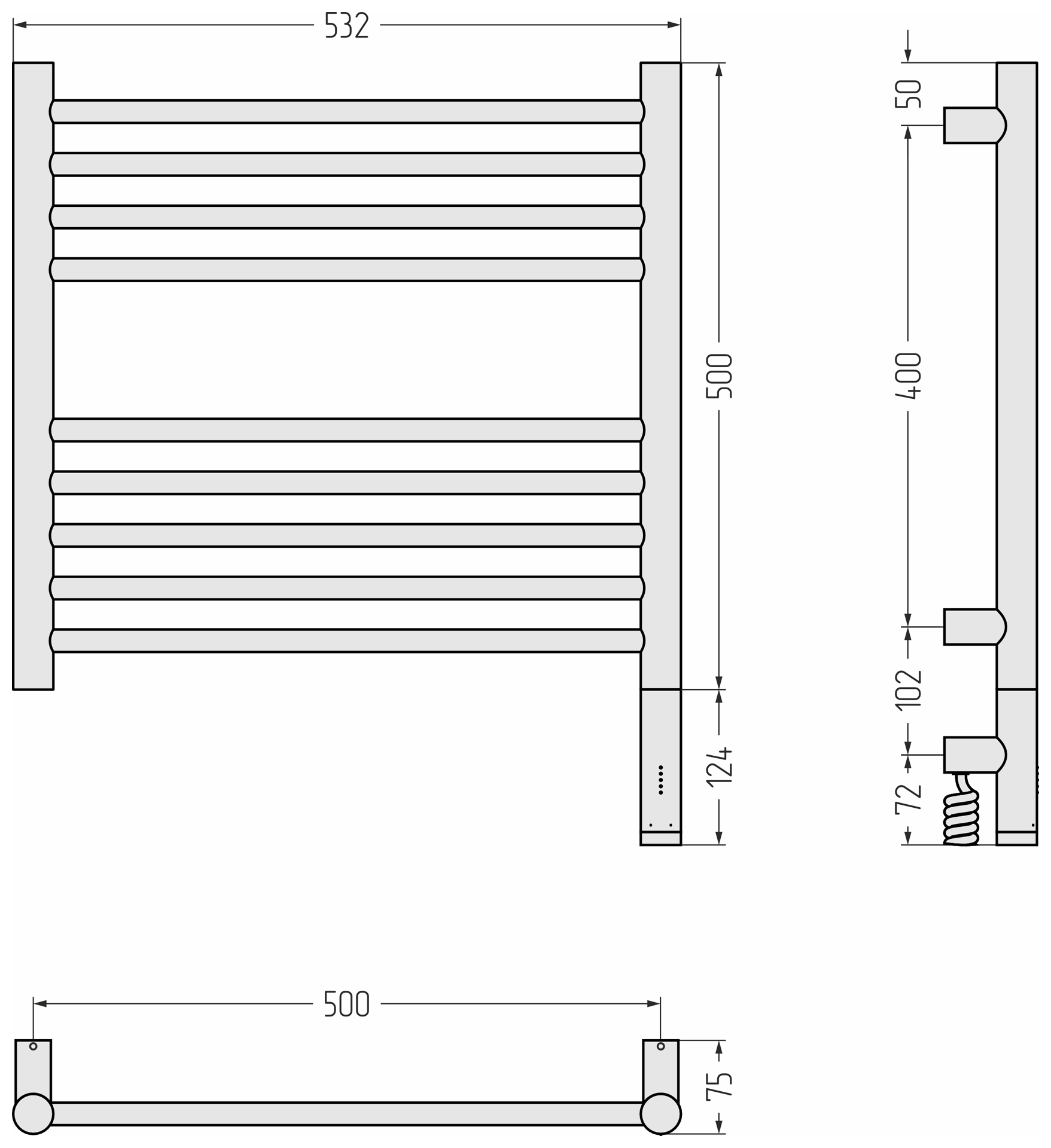 Состав поставки: полотенцесушитель, кабель, клеммы для скрытого монтажа, скрытые крепления, декоративная заглушка, шестигранный ключ, дюбели и саморезы