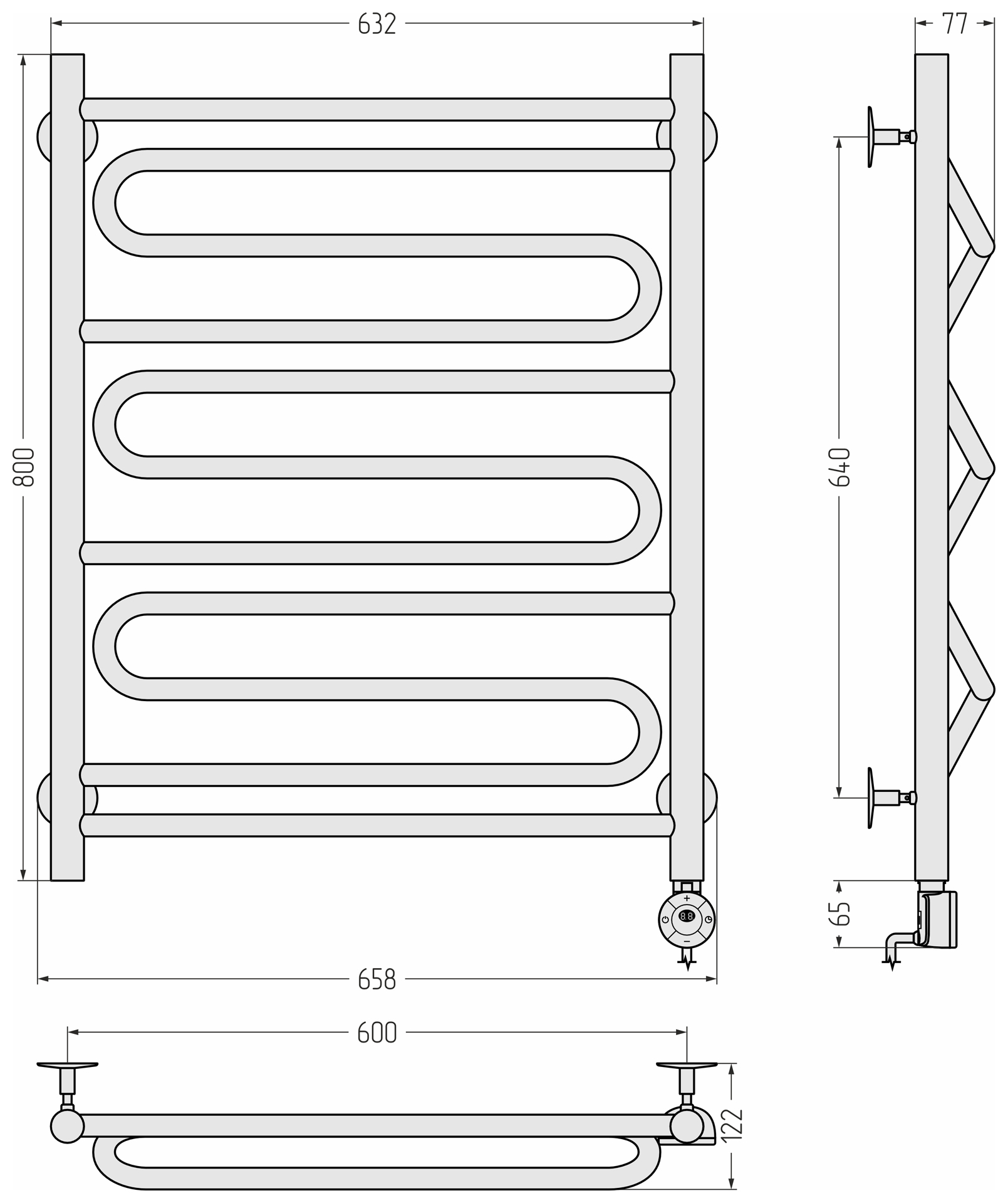 Состав поставки: полотенцесушитель, спускной клапан, отражатели, эксцентрики и опоры кронштейнов, комплект прокладок, шестигранные ключи, дюбели и саморезы