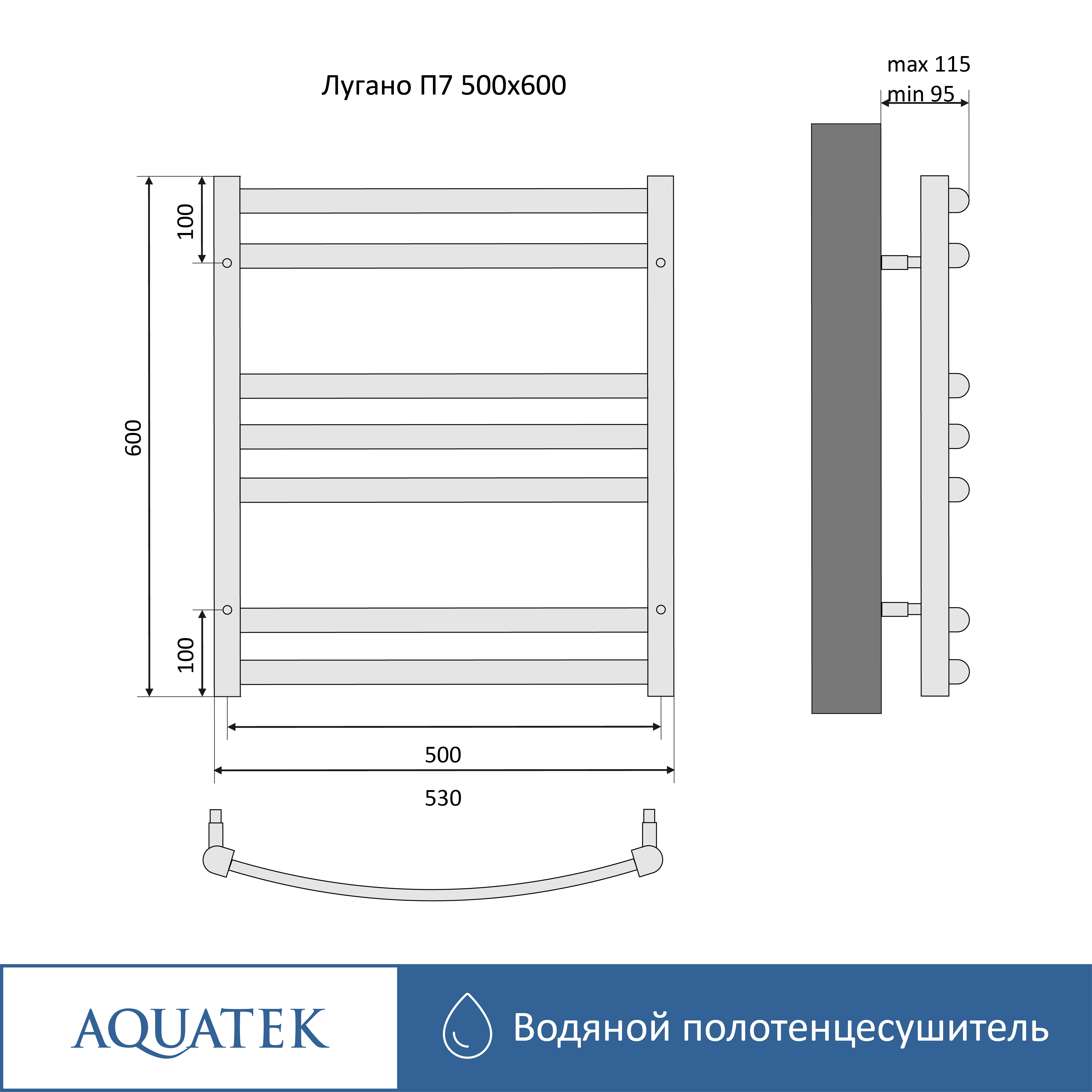 Полотенцесушитель водяной Aquatek (Акватек) Лугано П7 500х600 мм, подключение нижнее/диагональное, сверхпрочная пищевая нержавеющая сталь AISI 304L, гарантия 10 лет