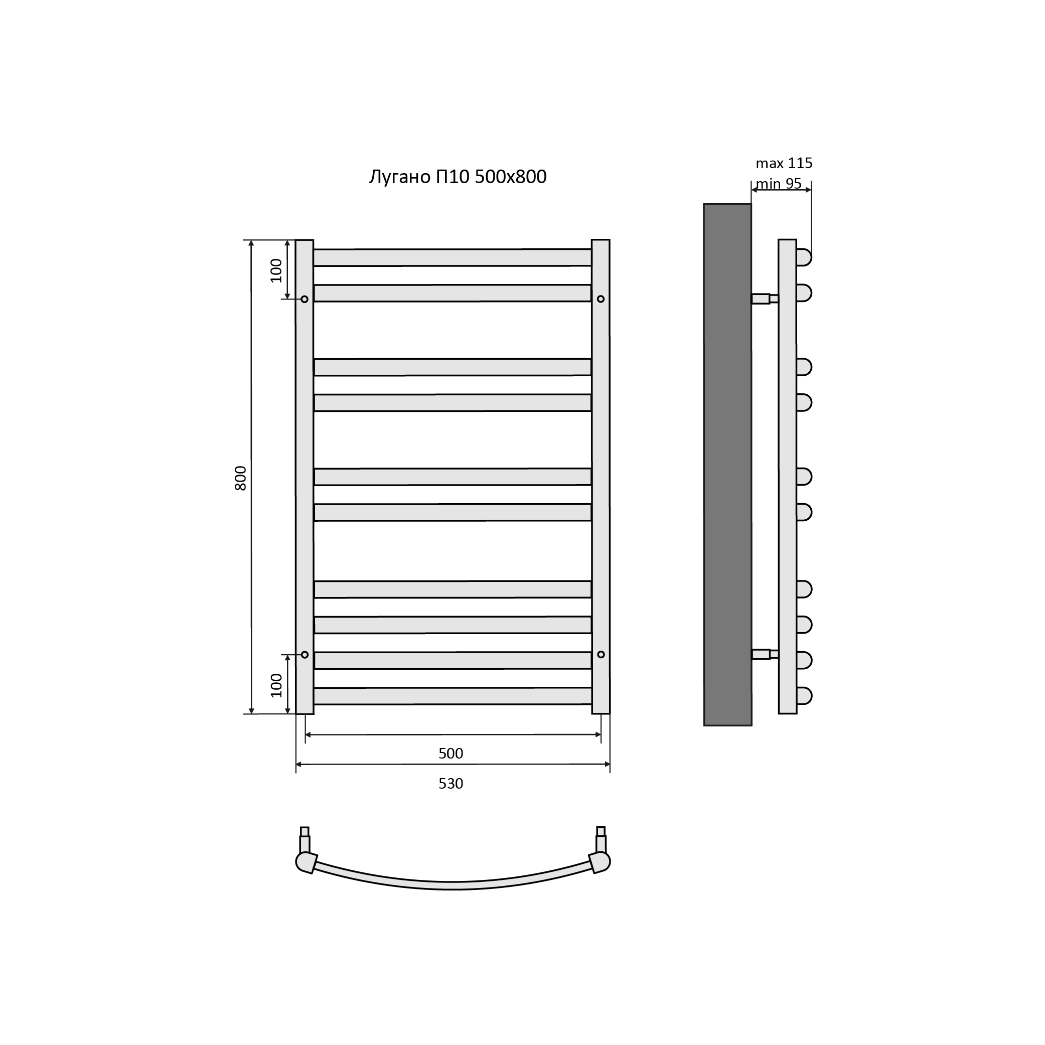 Полотенцесушитель водяной Aquatek (Акватек) Лугано П10 500х800 мм, черный муар, подключение нижнее/диагональное, сверхпрочная пищевая нержавеющая сталь AISI 304L, гарантия 10 лет