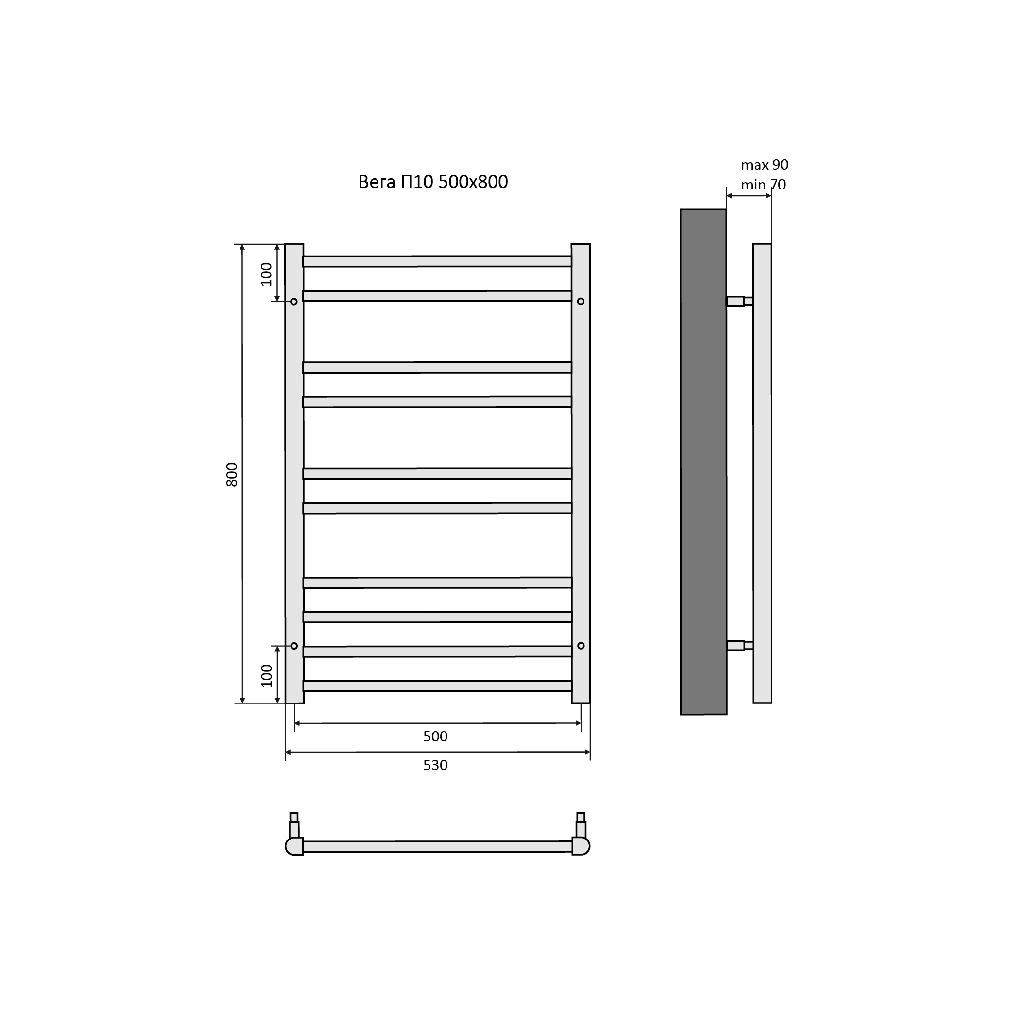 Полотенцесушитель водяной Aquatek (Акватек) Вега П10 500х800 мм, черный муар, подключение нижнее/диагональное, сверхпрочная пищевая нержавеющая сталь AISI 304L, гарантия 10 лет
