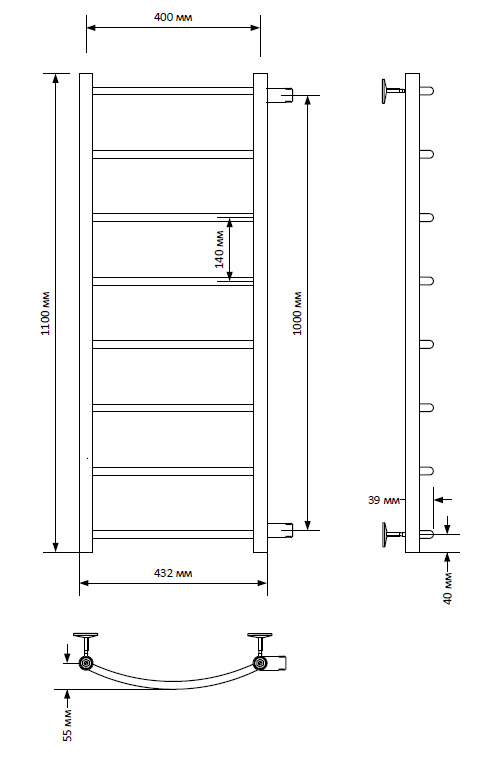 Полотенцесушитель водяной INDIGO Arc с боковым подключением в размере 1100х400 (ВхШ).