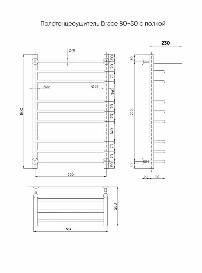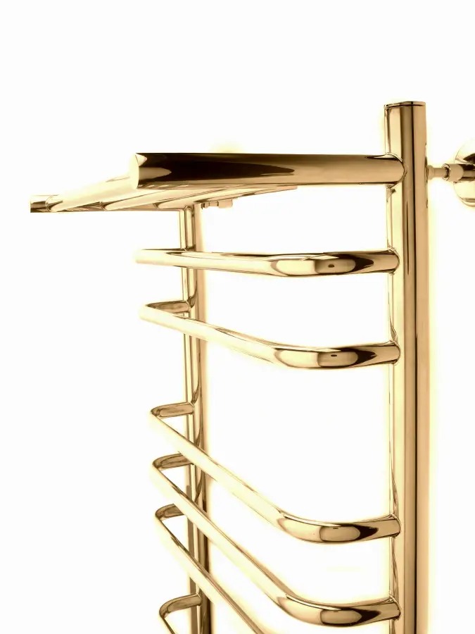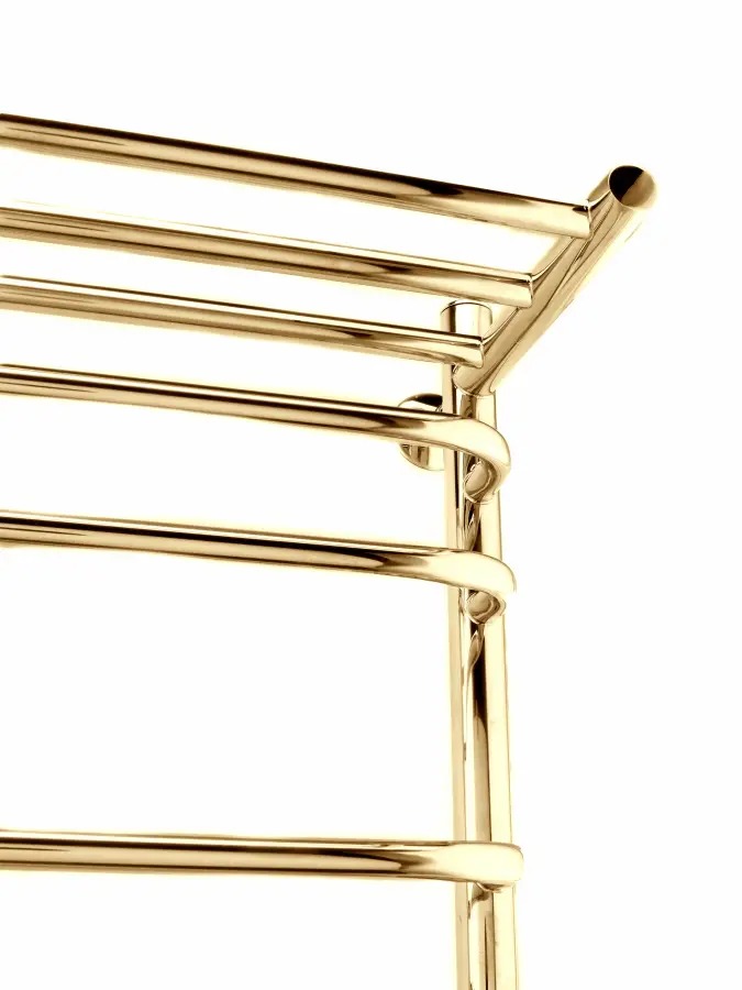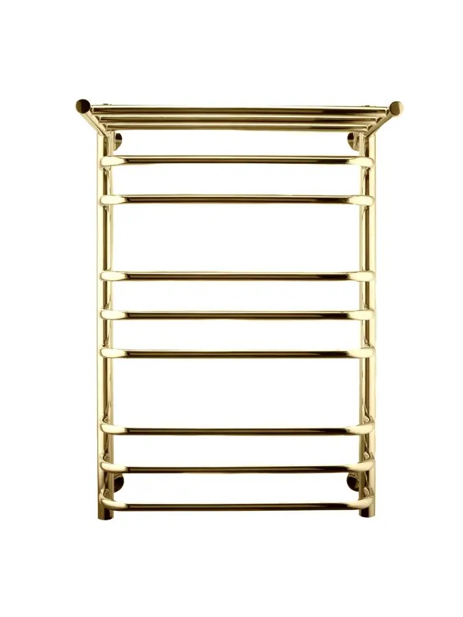 Полотенцесушитель водяной INDIGO Brace с полкой в размере 800х500 (ВхШ) выбирают за его скобообразные перекладины и функциональность. Модель изготовлена из высококачественной нержавеющей стали. Качественная металлообработка в местах подключений обеспечивает плотное прилегание прокладки. Изделие с безупречным блеском в золотом цвете. Комплектация включает в себя полный набор для подключения - к3.