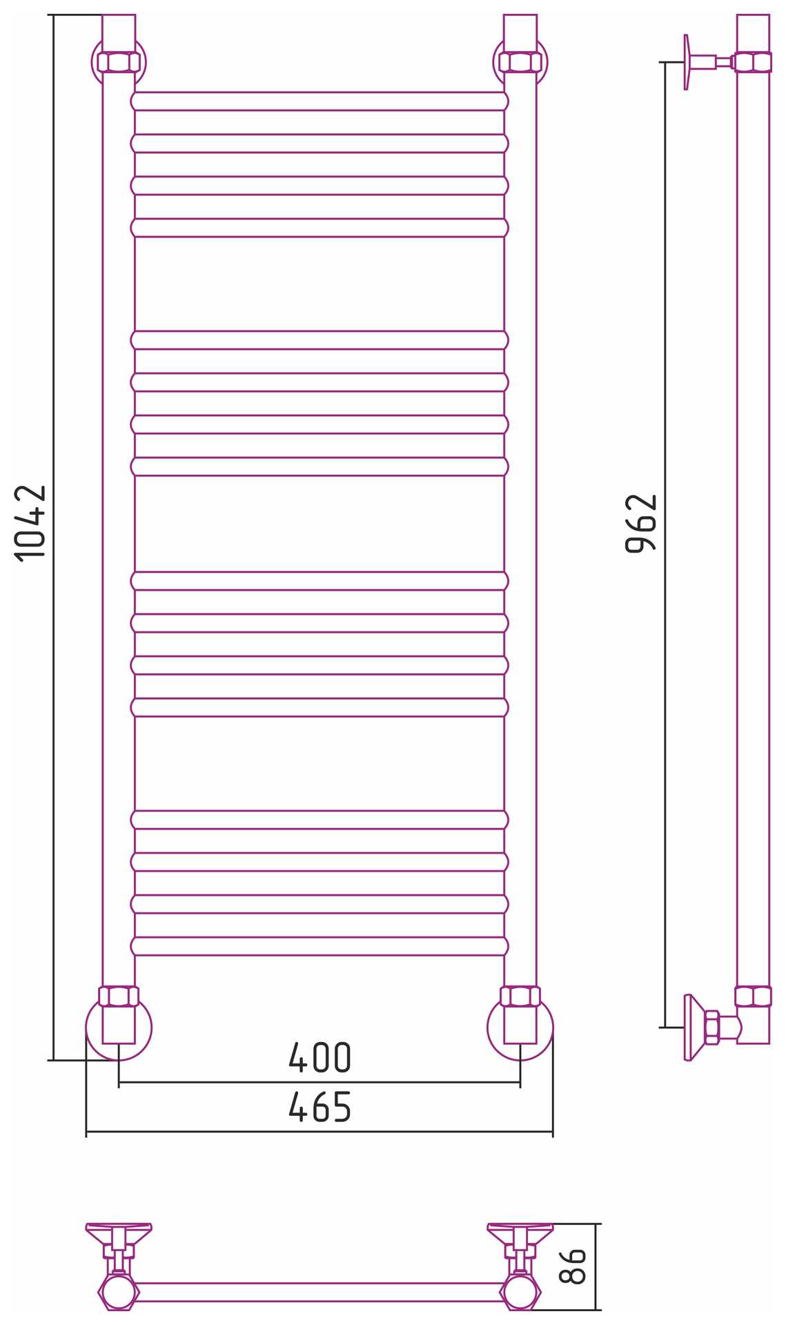 Комплектация: Полотенцесушитель, комплект для водяного подключения полотенцесушителя через угловые элементы с узлами для сброса воздуха.