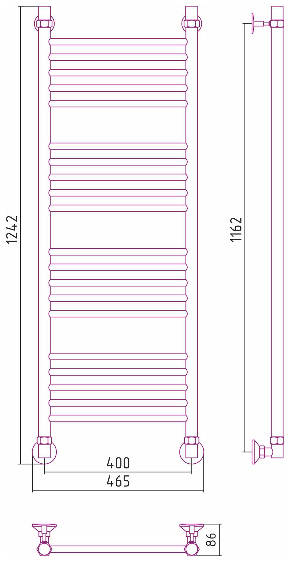 Состав поставки: полотенцесушитель, полный комплект для водяного подключения полотенцесушителя через угловые элементы с узлами для сброса воздуха.