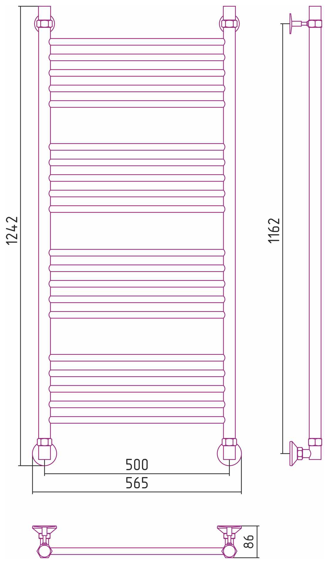 Состав поставки: полотенцесушитель, полный комплект для водяного подключения полотенцесушителя через угловые элементы с узлами для сброса воздуха.