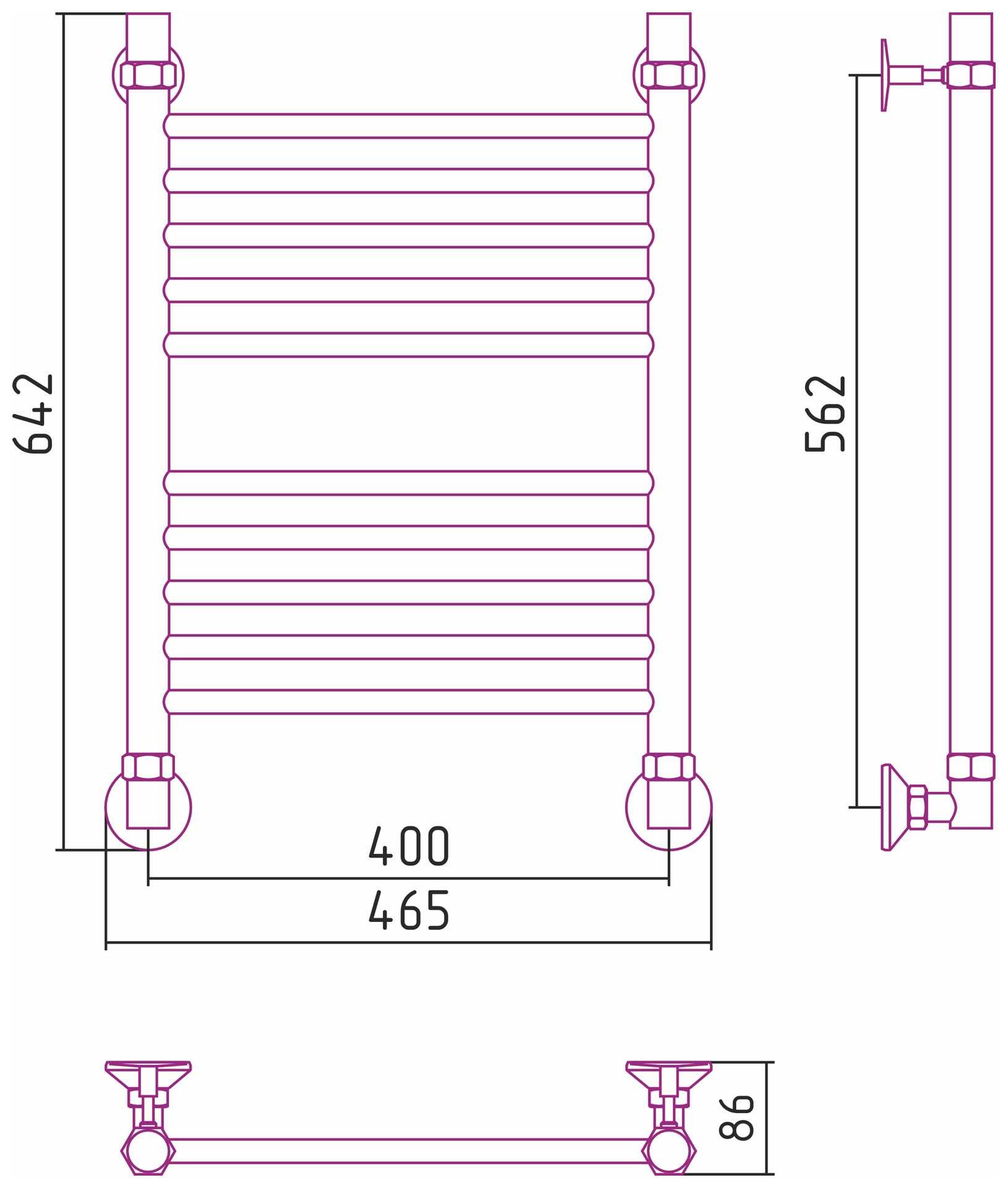 Состав поставки: полотенцесушитель, полный комплект для водяного подключения полотенцесушителя через угловые элементы с узлами для сброса воздуха.