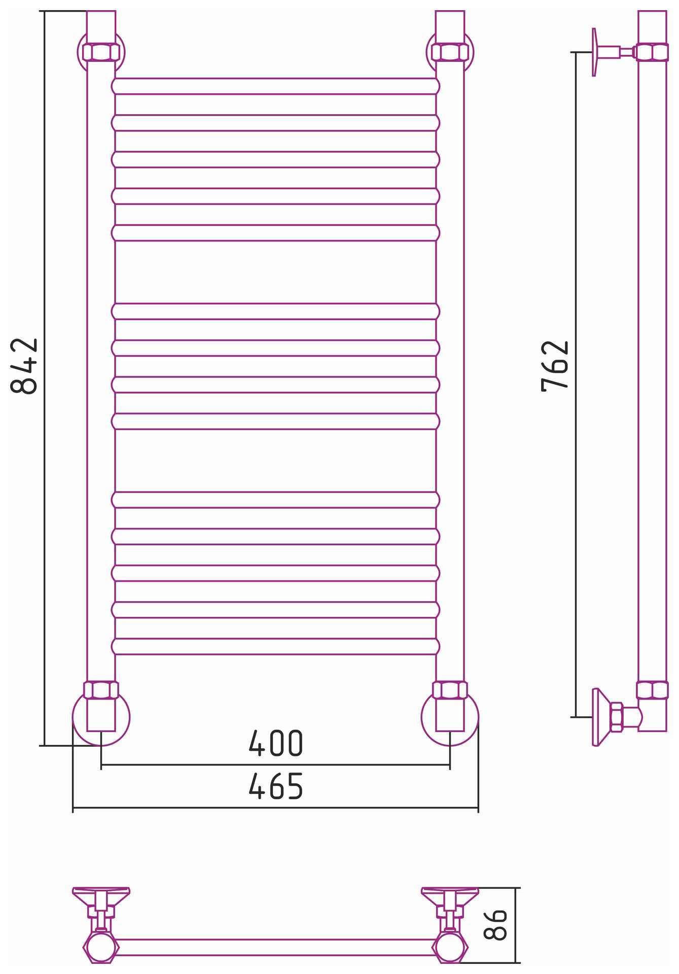 Состав поставки: полотенцесушитель, полный комплект для водяного подключения полотенцесушителя через угловые элементы с узлами для сброса воздуха.