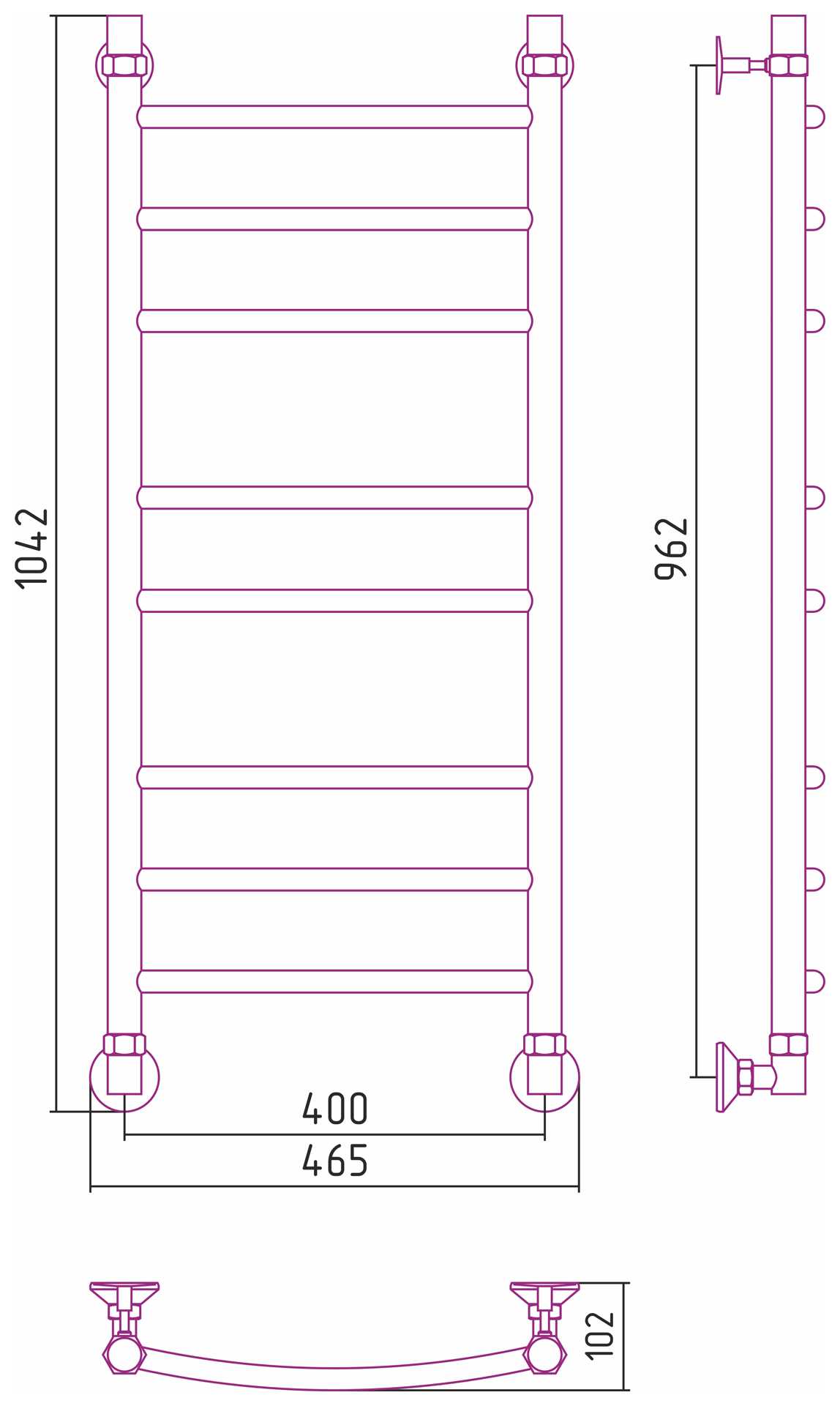 Состав поставки: полотенцесушитель, полный комплект для водяного подключения полотенцесушителя через угловые элементы с узлами для сброса воздуха.