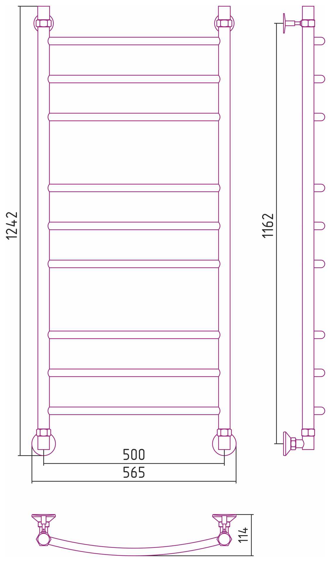 Комплектация: Полотенцесушитель, комплект для водяного подключения полотенцесушителя через угловые элементы с узлами для сброса воздуха.