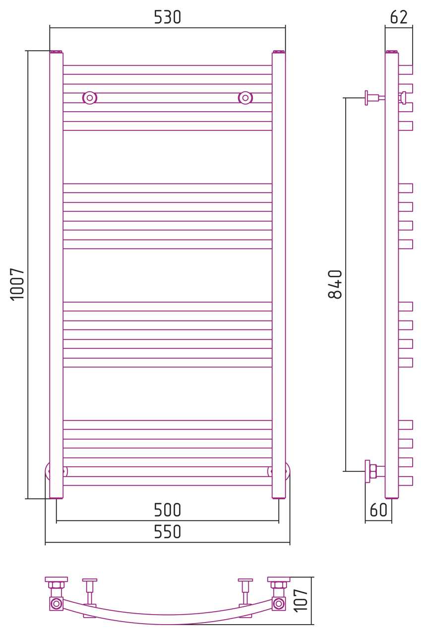 Комплектация: Полотенцесушитель - 1 шт., гайка накидная G 1" (несъемная) - 2 шт., силиконовая прокладка G 1" - 2 шт., кронштейн - 1 к-т., ключ ШГ №2,5 - 1 шт., паспорт., упаковка