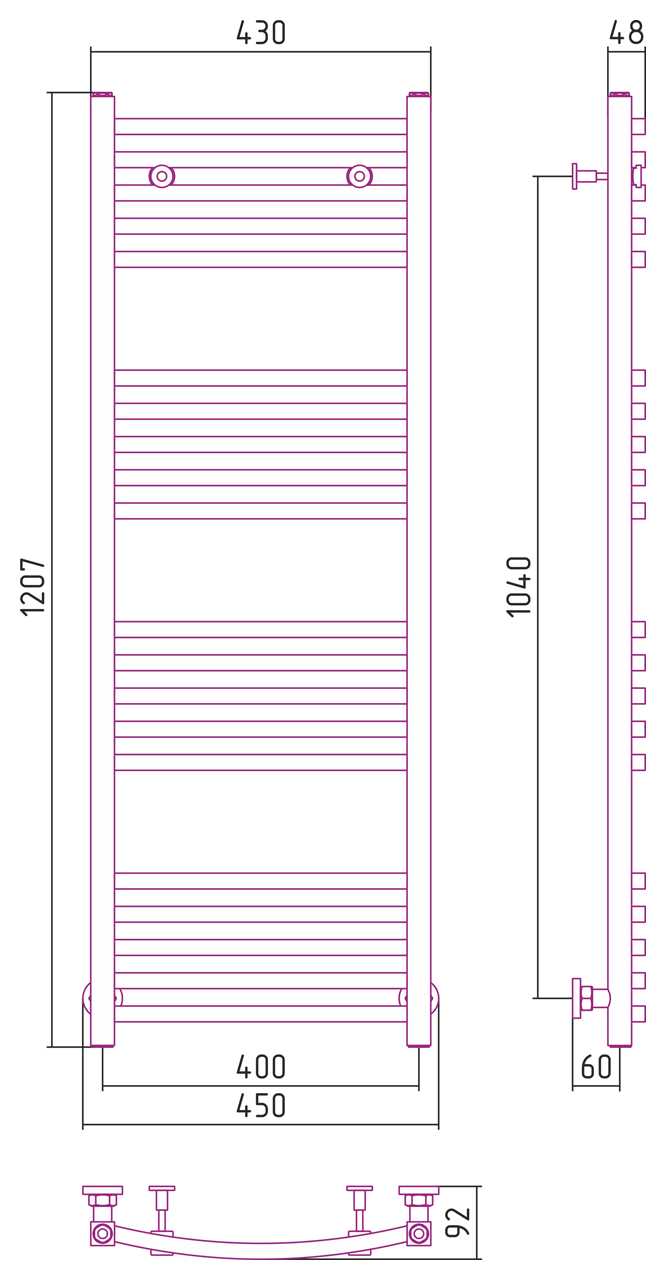 Комплектация: Полотенцесушитель - 1 шт., гайка накидная G 1" (несъемная) - 2 шт., силиконовая прокладка G 1" - 2 шт., кронштейн - 1 к-т., ключ ШГ №2,5 - 1 шт., паспорт., упаковка