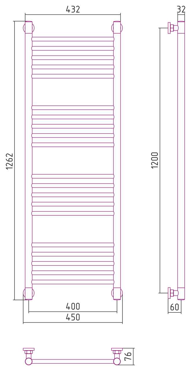 Комплектация: Полотенцесушительу, гловые элементы, спускной клапан, отражатели, эксцентрики и опоры кронштейнов, декоративные заглушки, комплект прокладок, шестигранные ключи, дюбели и саморезы