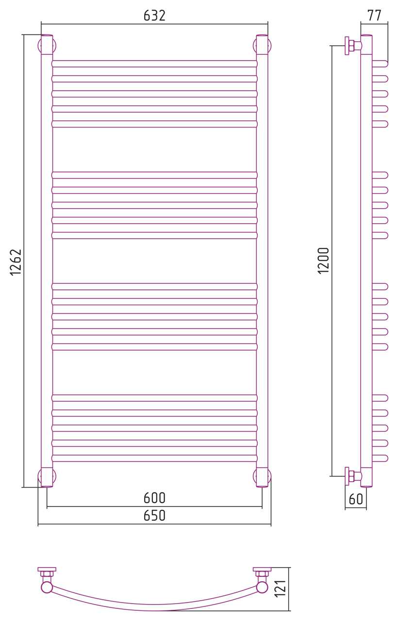 Комплектация: Полотенцесушительу, гловые элементы, спускной клапан, отражатели, эксцентрики и опоры кронштейнов, декоративные заглушки, комплект прокладок, шестигранные ключи, дюбели и саморезы