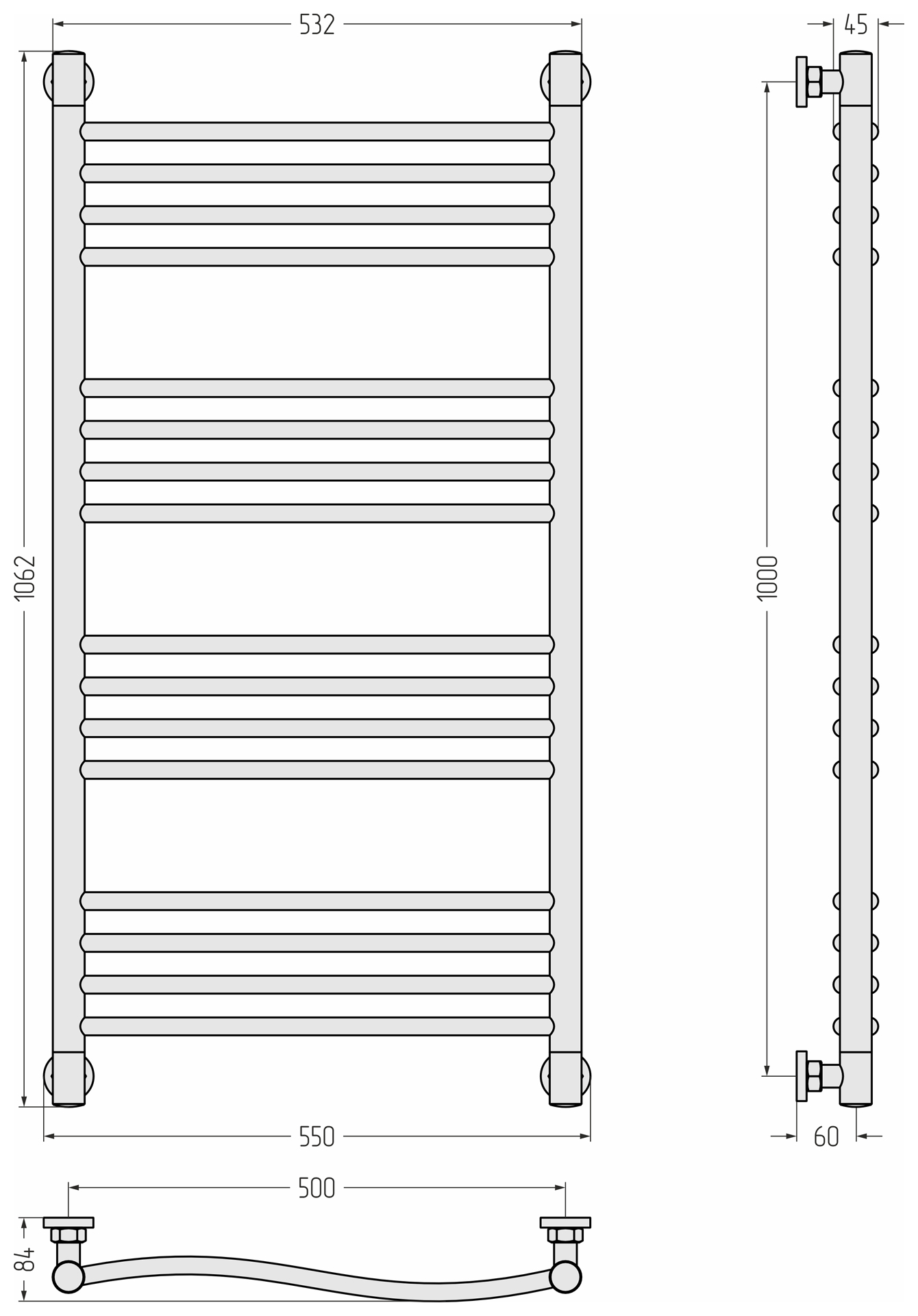 Комплектация: полотенцесушитель, угловые элементы, спускной клапан, отражатели, эксцентрики и опоры кронштейнов, декоративные заглушки, комплект прокладок, шестигранные ключи, дюбели и саморезы