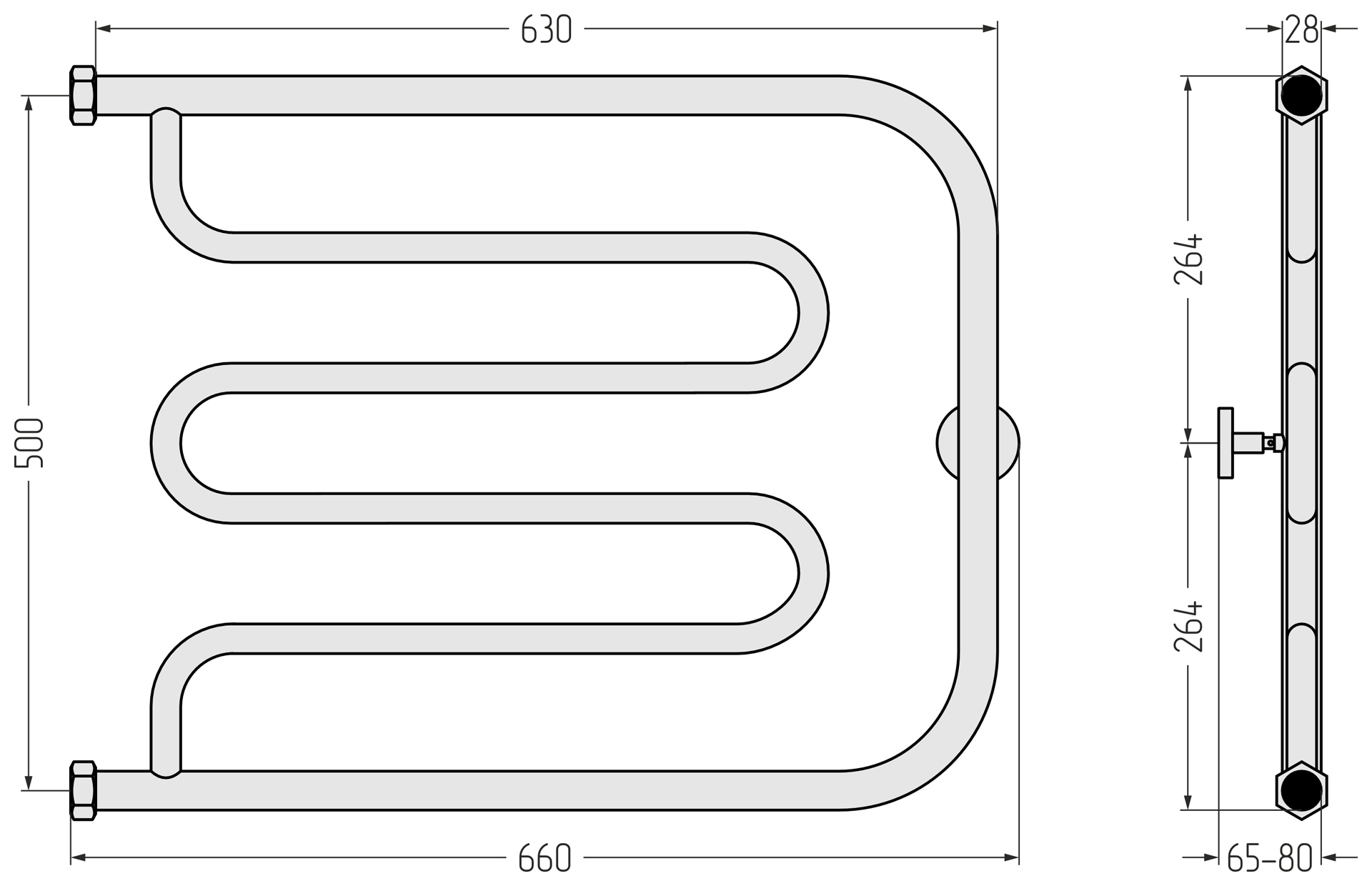 Состав поставки: полотенцесушитель, спускной клапан, отражатели, эксцентрики и опоры кронштейнов, комплект прокладок, шестигранные ключи, дюбели и саморезы