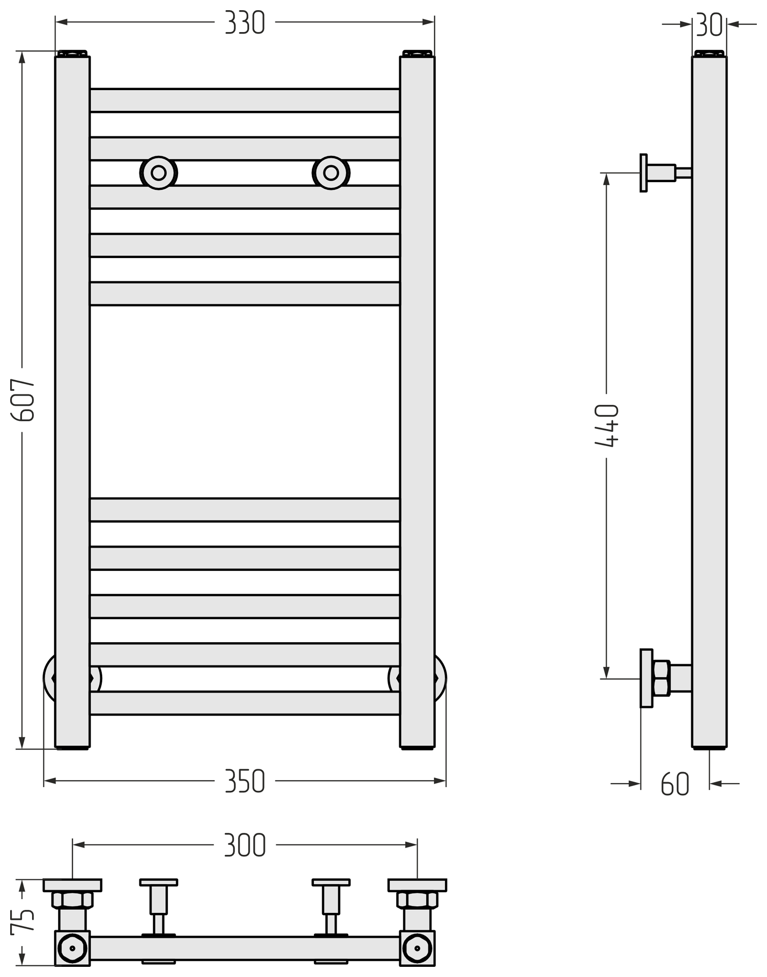 Состав поставки: полотенцесушитель, спускной клапан, отражатели, эксцентрики и опоры кронштейнов, комплект прокладок, шестигранные ключи, дюбели и саморезы