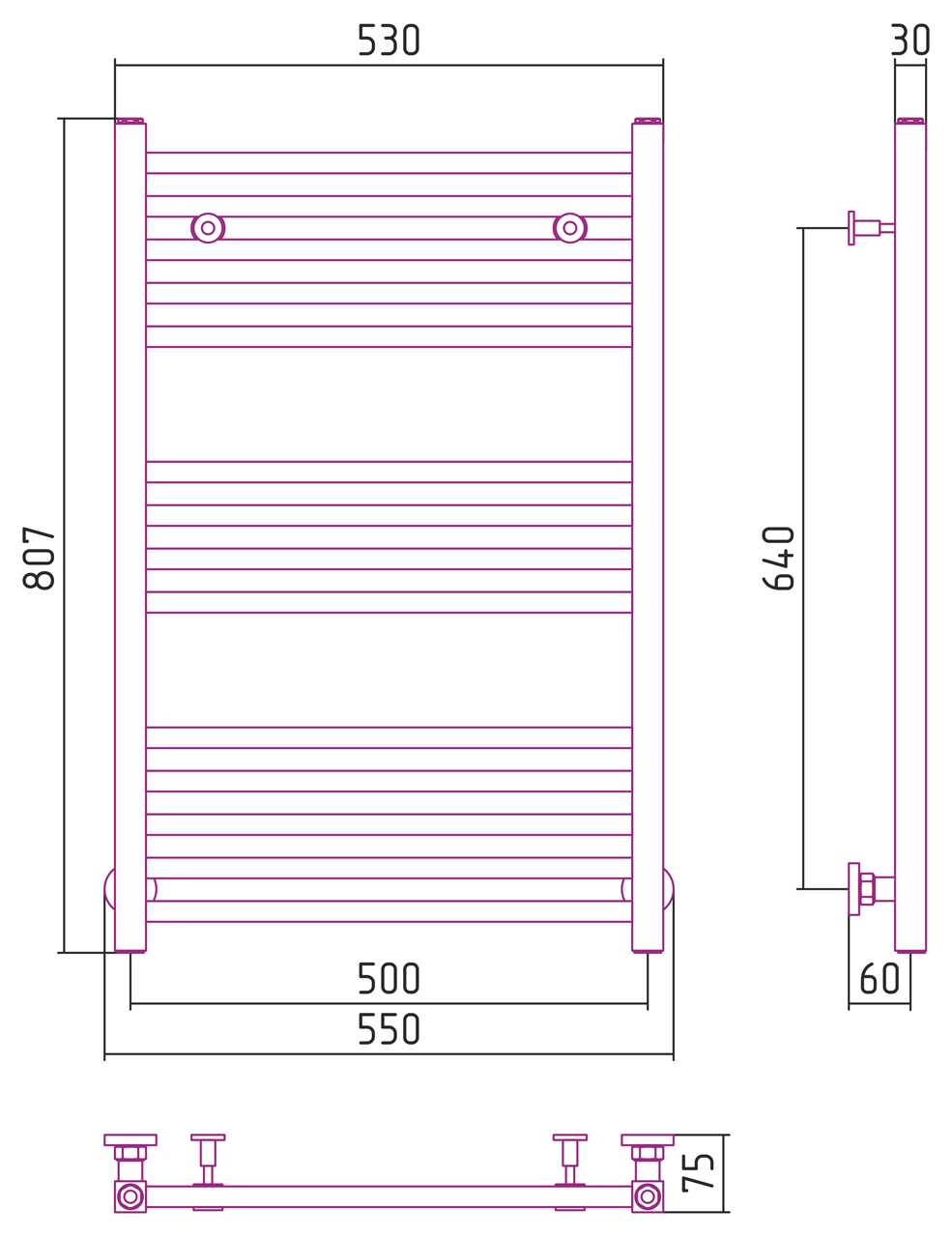 Комплектация: Полотенцесушитель, элементы с накидной гайкой для подключения, спускной клапан, телескопические кронштейны, отражатели и эксцентрики, заглушки для коллектора, комплект прокладок, шестигранные ключи, дюбели и саморезы